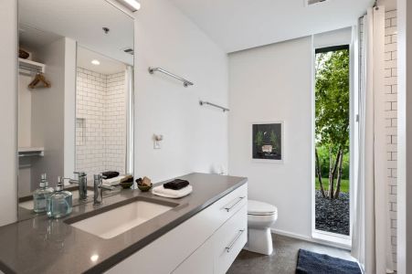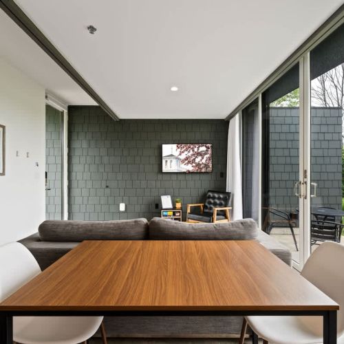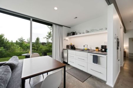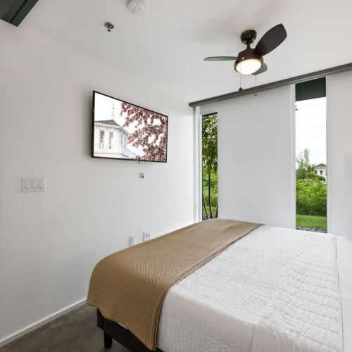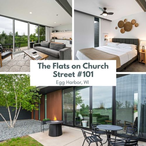 Discover a modern and inviting escape in the heart of Egg Harbor. The Flats on Church Street offer the perfect setting for a romantic winter getaway, blending thoughtful design with cozy amenities to create a serene retreat. Each 1-bedroom, 1-bathroom flat features floor-to-ceiling windows that frame peaceful views of the private patio, creating a bright and welcoming atmosphere. With in-floor heating, you’ll stay warm and comfortable, even on the coldest days, while the spa-inspired bathroom, complete with a sleek walk-in shower, provides a relaxing start or finish to your day.