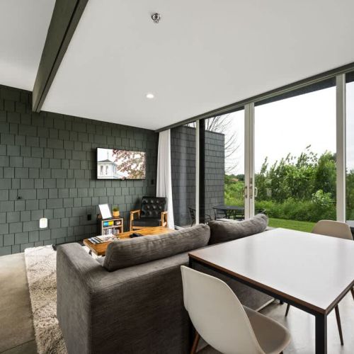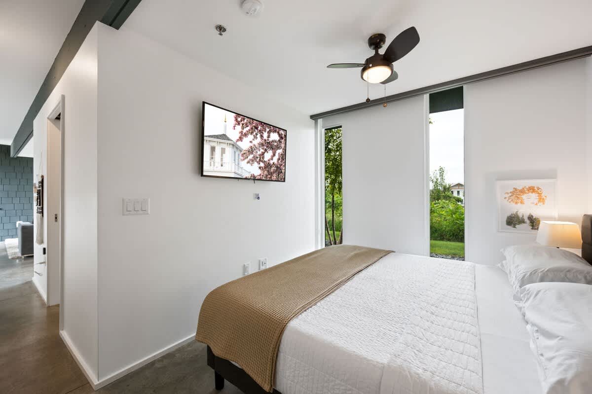 The Flats were designed to make the most of the 500 sq ft of space, with a king-sized bed in the bedroom, a beautifully tiled shower with modern fixtures in the bathroom, and a fully equipped kitchen with an induction cooktop stove, refrigerator, dishwasher, microwave, coffee maker, and all the necessary amenities for meal preparation.