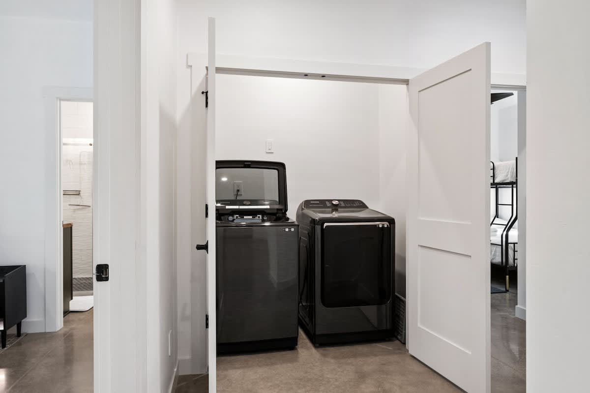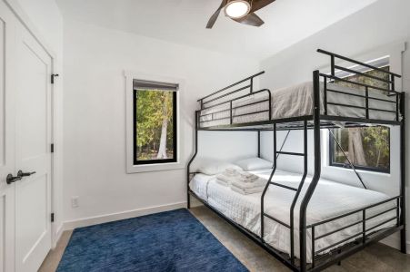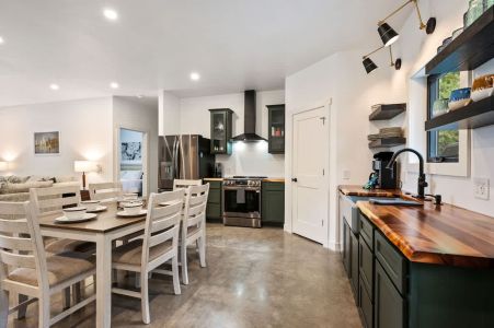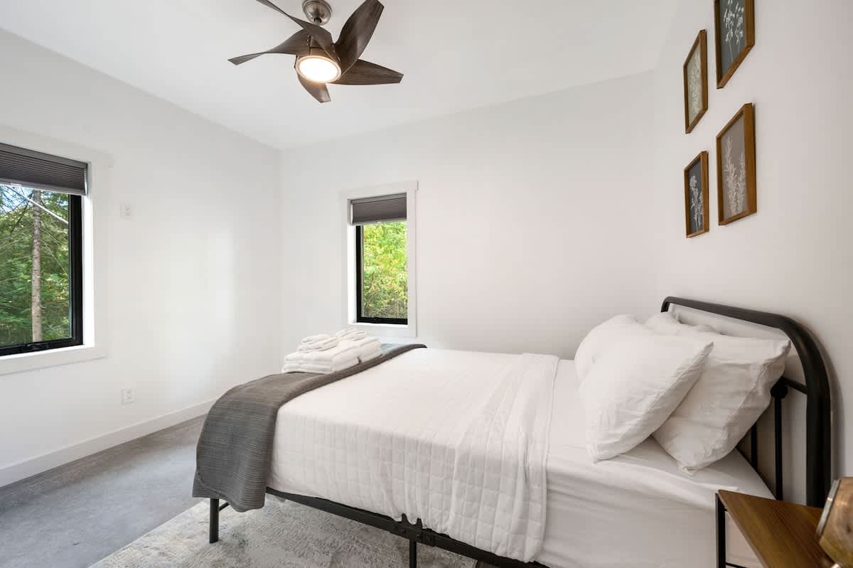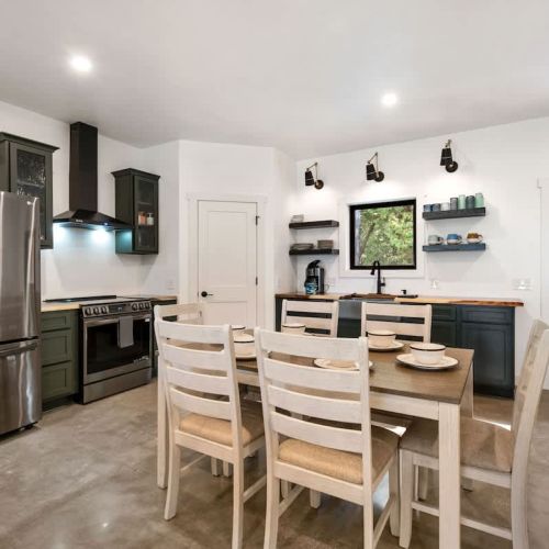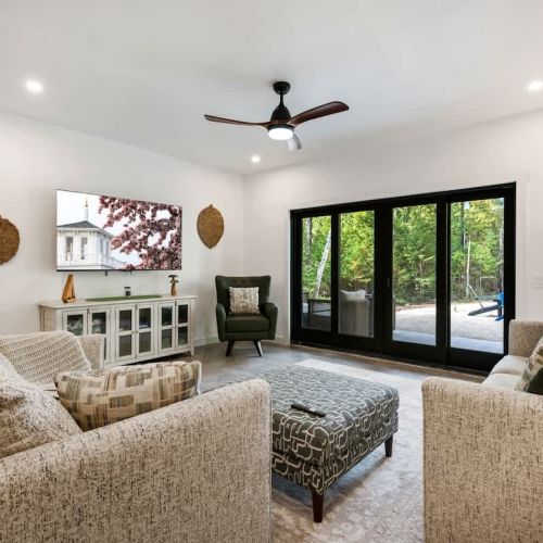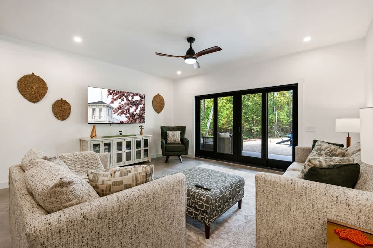 The open-concept living space is perfect for gathering after a day of exploring. With high-end finishes, comfortable seating, and large windows that frame the surrounding woods, this space invites you to unwind. Whether you're watching your favorite shows on the smart TV or enjoying a cozy evening by the fire, Cedar Cove creates a welcoming atmosphere for all.