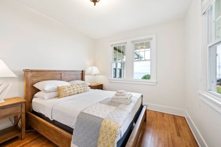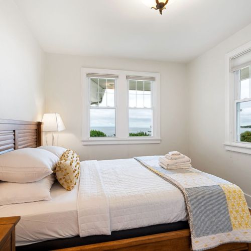 Each of the two bedrooms is furnished with a plush queen bed and quality linens to ensure a restful stay. Whether you're soaking in the lake breeze from the porch or gathering in the open living space after a day of exploring, the Bayside Cabin offers a peaceful and well-appointed space to make lasting memories.