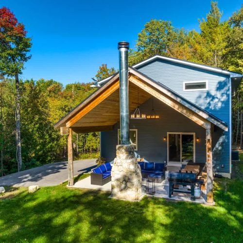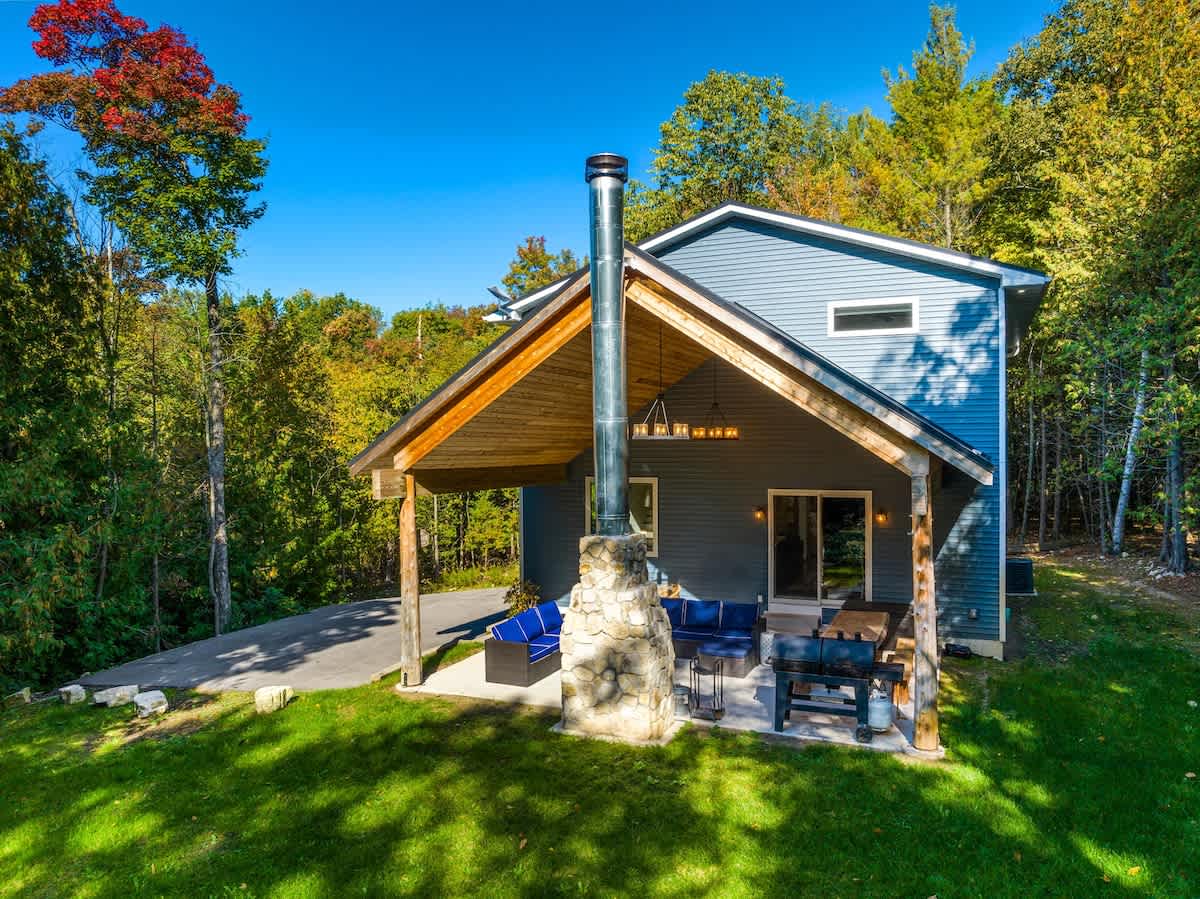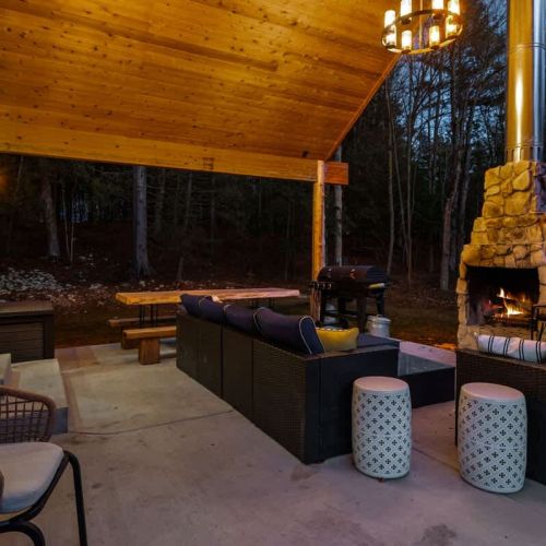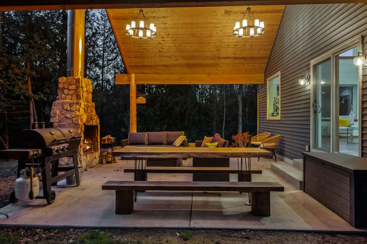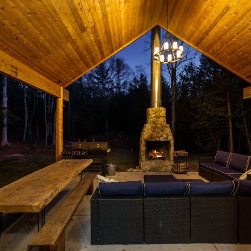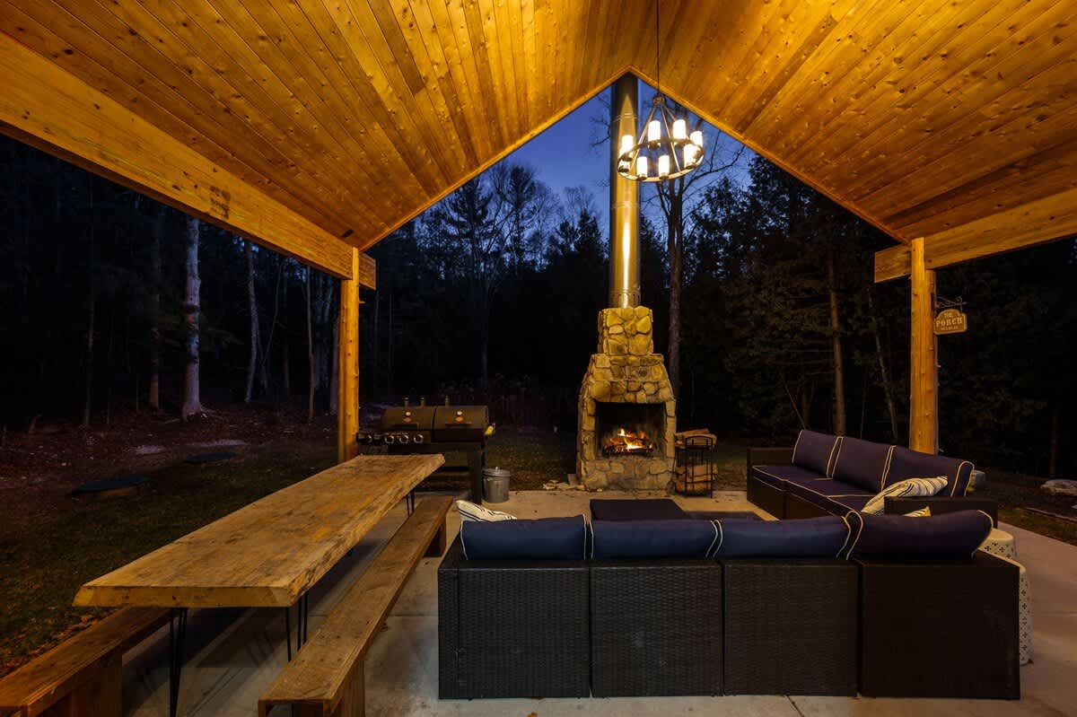 One of the highlights of this retreat is the indoor fireplace, where you can unwind by the crackling flames on cooler evenings. Additionally, the cottage boasts an outdoor fireplace on the expansive patio, overlooking the peaceful 1.5-acre wooded property. It's the ideal spot to toast marshmallows, sip on a glass of wine, or simply relish the serenity of nature.
