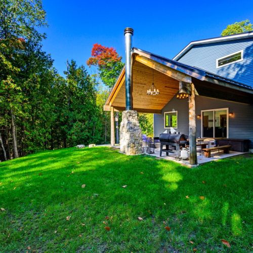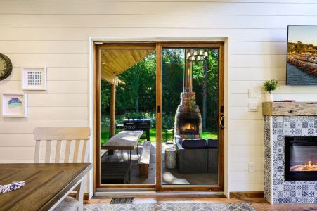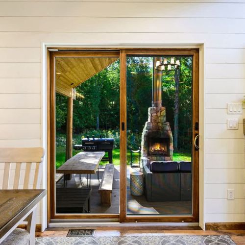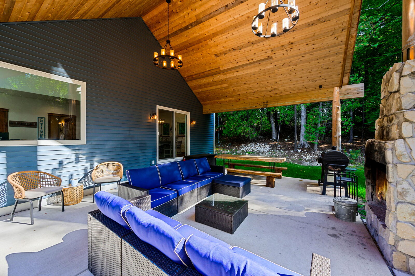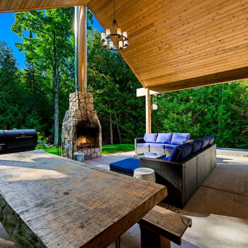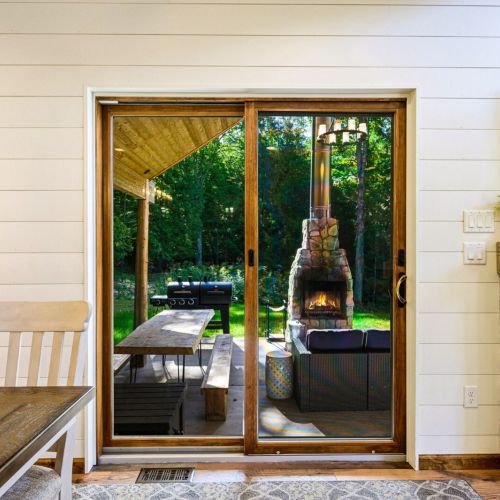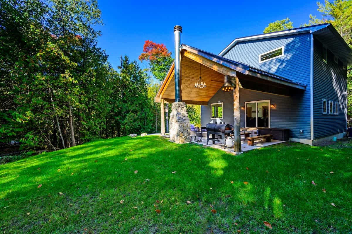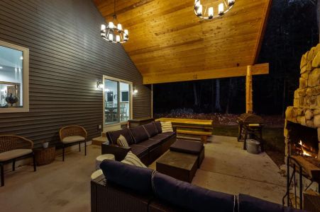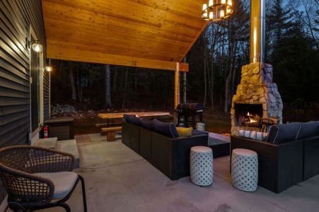 One of the highlights of this retreat is the indoor fireplace, where you can unwind by the crackling flames on cooler evenings. Additionally, the cottage boasts an outdoor fireplace on the expansive patio, overlooking the peaceful 1.5-acre wooded property. It's the ideal spot to toast marshmallows, sip on a glass of wine, or simply relish the serenity of nature.