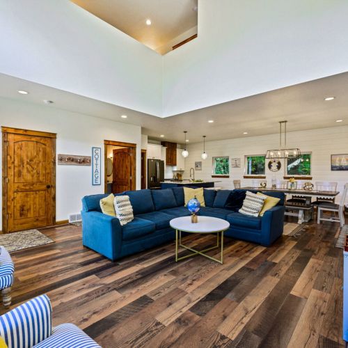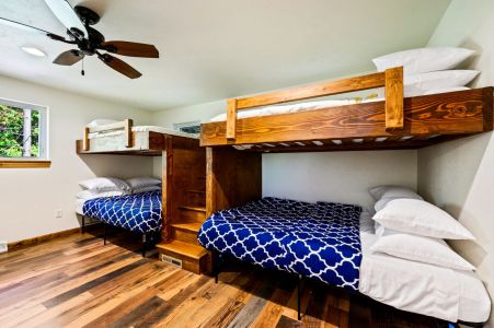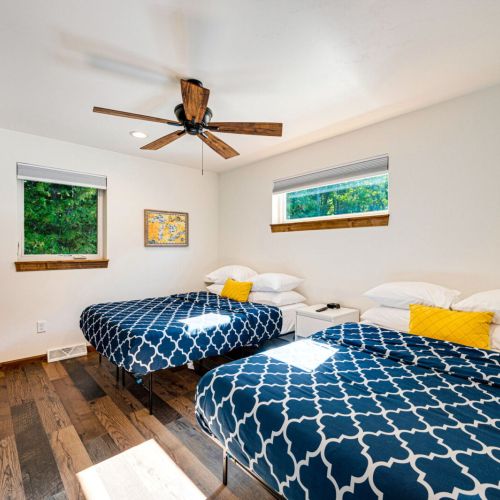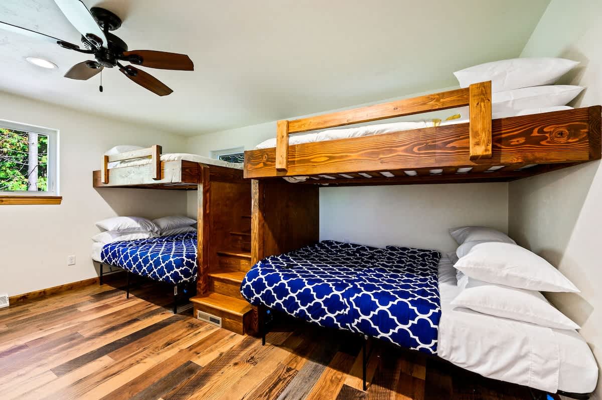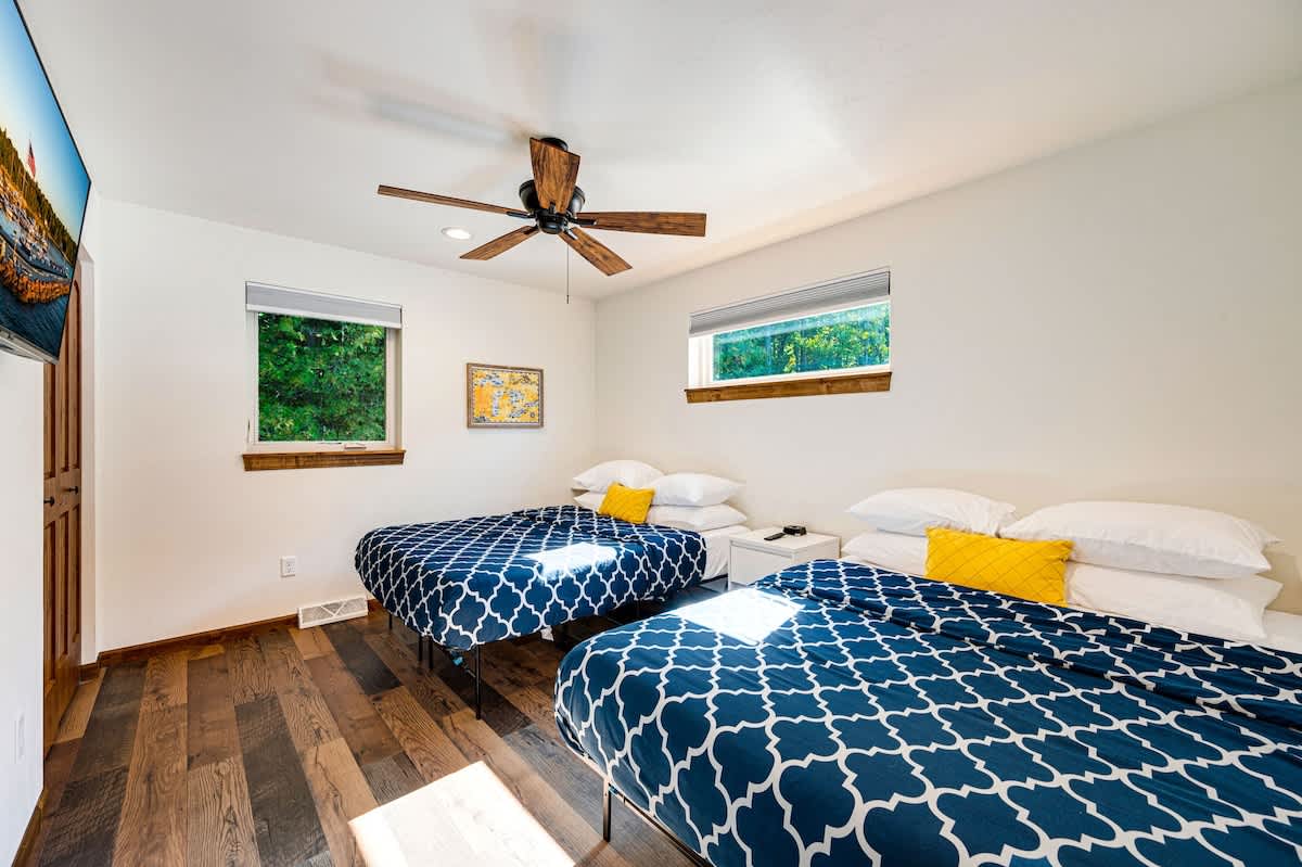 Inside, you'll find two beautifully appointed bedrooms. The first bedroom features two plush queen beds, while the second bedroom offers the perfect setup with two full-over-queen bunk beds, ensuring everyone has their own comfortable space. Additional amenities include keyless entry for your convenience, Wi-Fi access throughout, a Wi-Fi printer on-site, extra blankets for those cozy nights in, and Smart TVs to keep you entertained.
