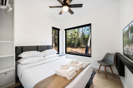 The cabin features a thoughtfully designed space that blends modern comfort with natural charm. The bedroom includes a queen bed with plush linens, ensuring a restful night’s sleep. The large picture windows create the sensation of being completely surrounded by nature. The full bathroom is equipped with all the essentials to make your stay comfortable, and the cabin also offers a washer and dryer for your convenience.