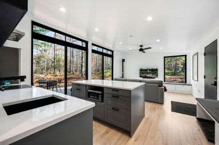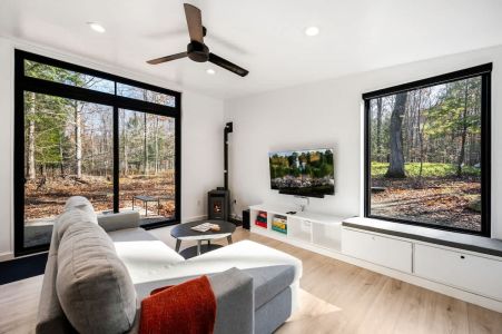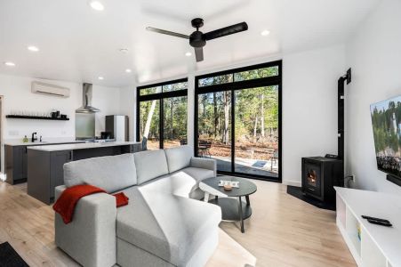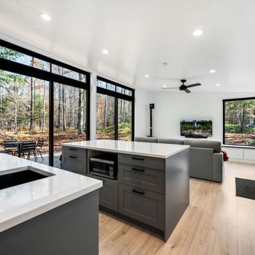 The open-concept living area boasts large floor-to-ceiling windows, flooding the space with natural light and offering picturesque views of the wooded property. The cozy fireplace creates a warm and inviting atmosphere, perfect for unwinding after a day of exploring the peninsula.