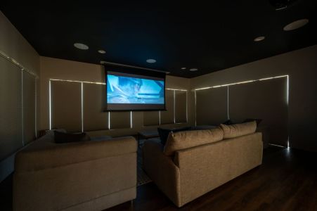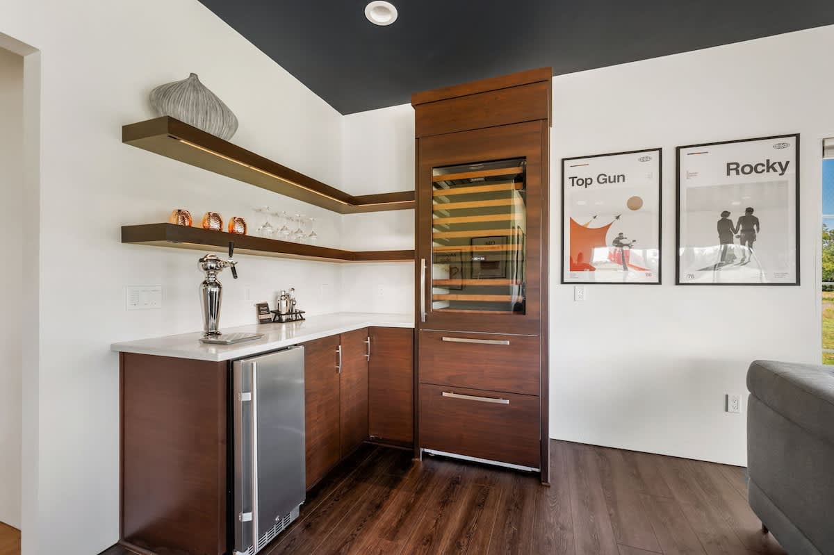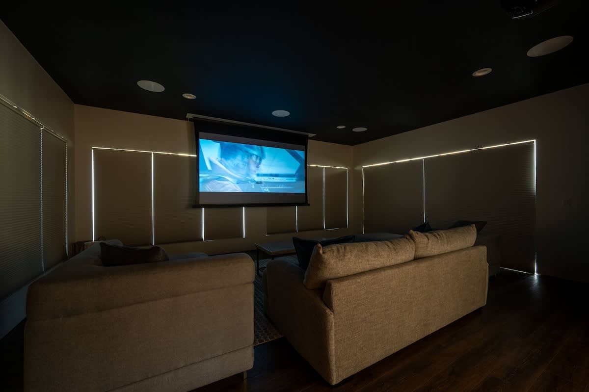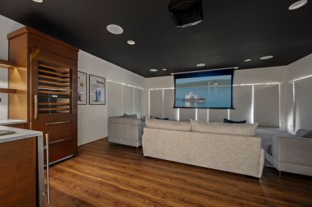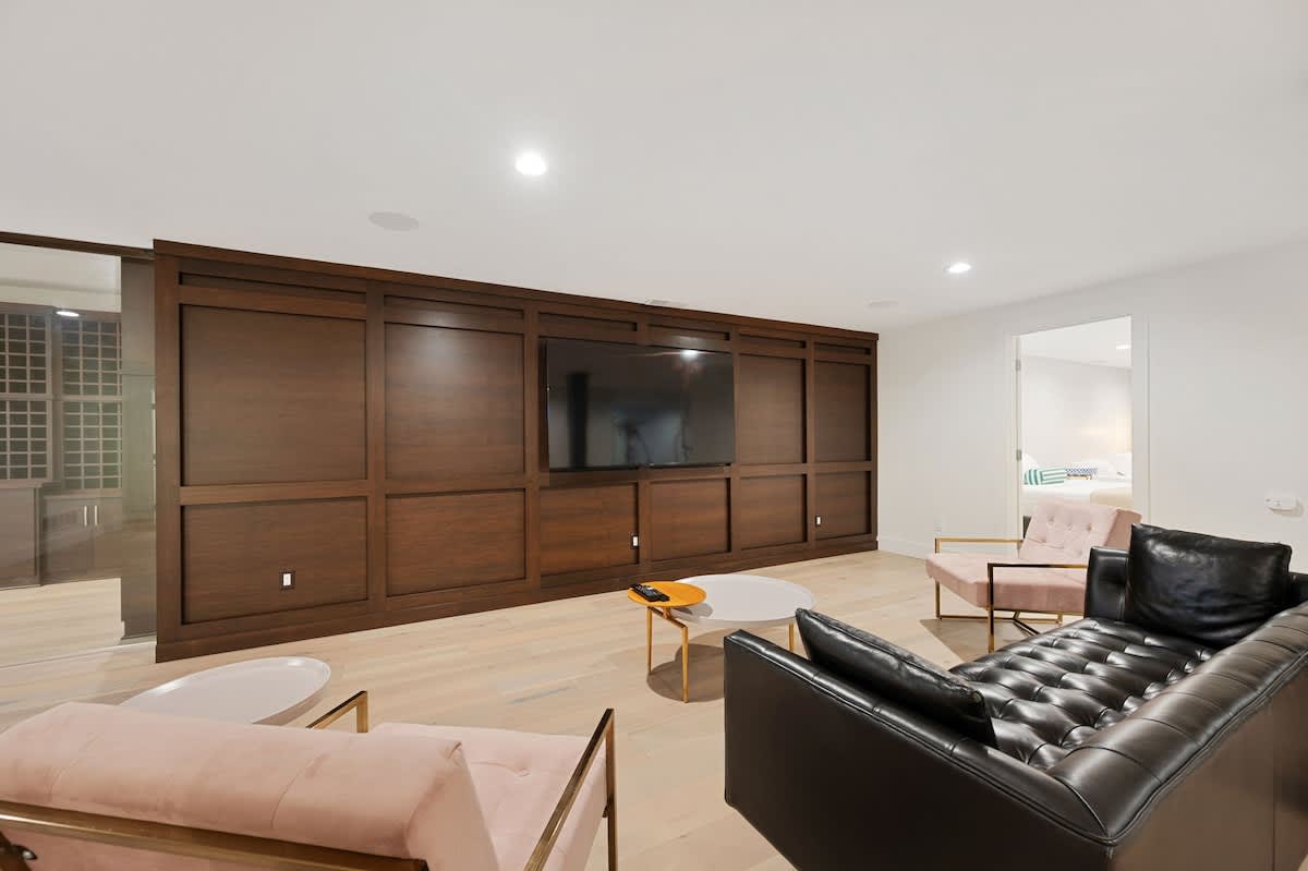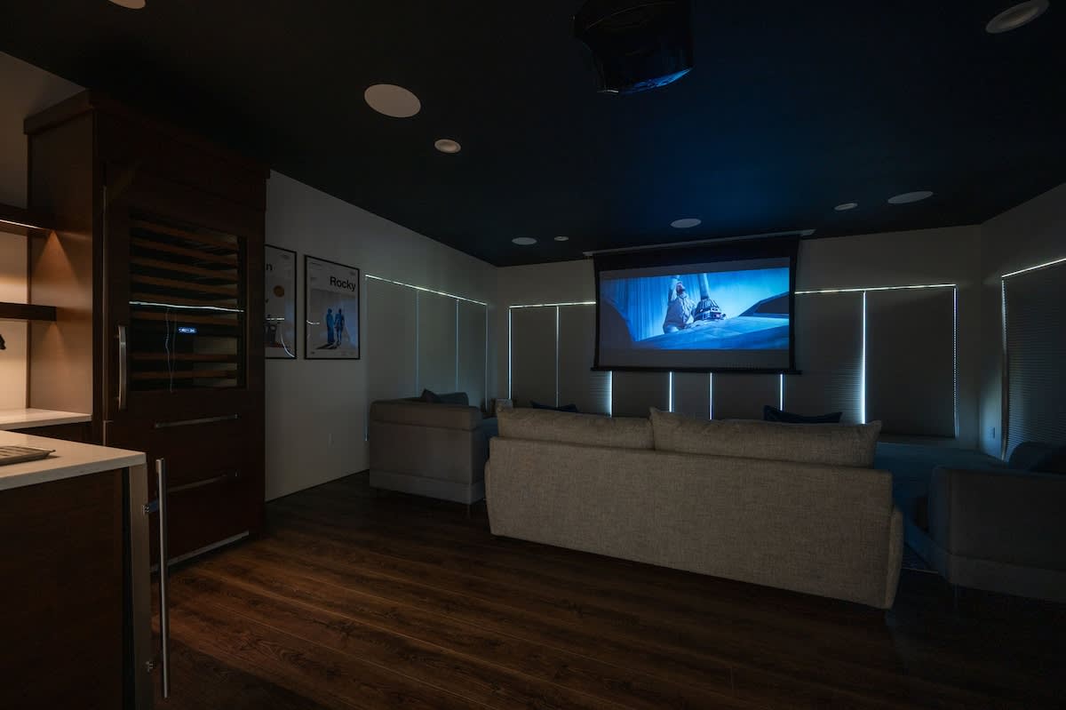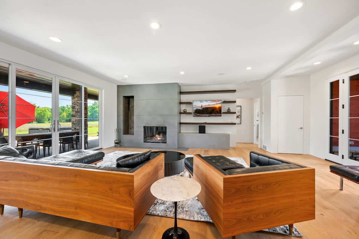 The open-concept living area centers around an indoor fireplace, with upscale finishes and plenty of space to gather. Additional highlights include a private home theater, separate office/workspace, and wine cellar/storage room.