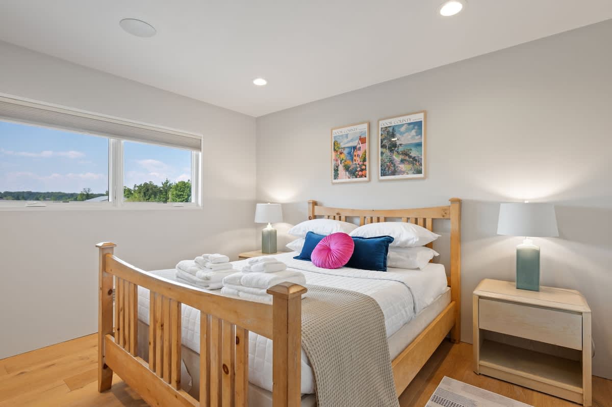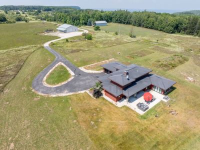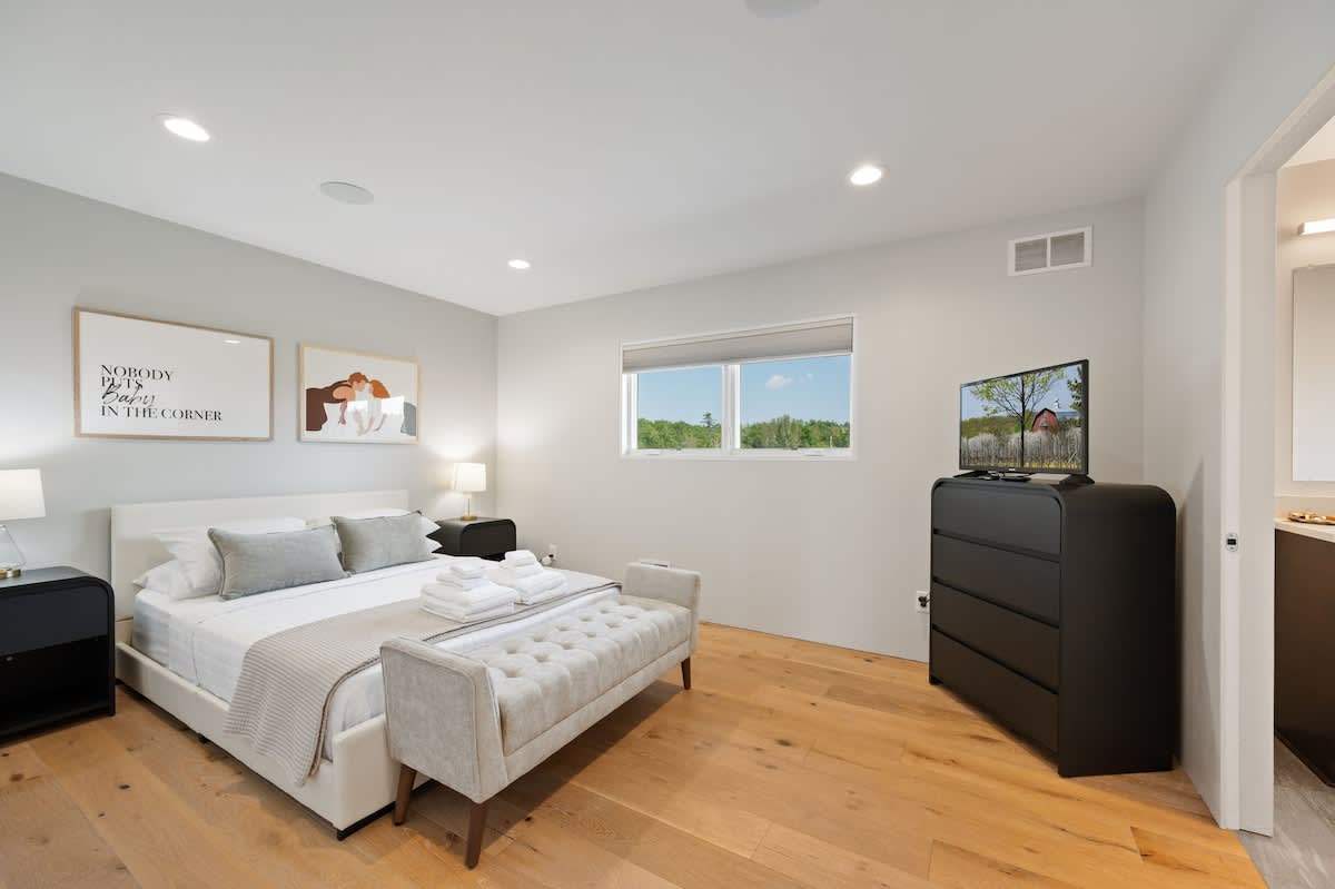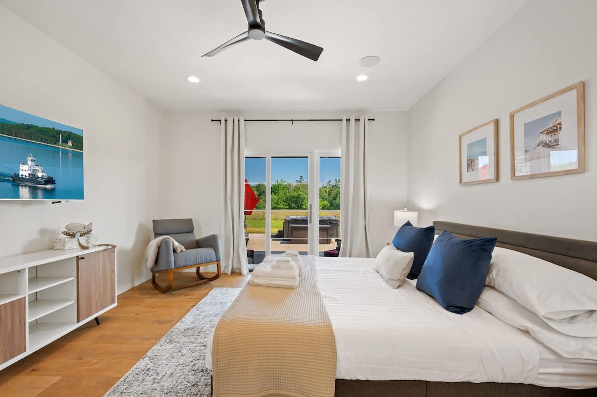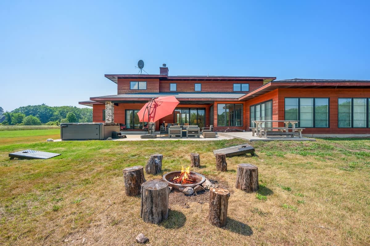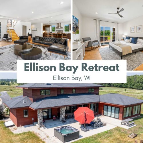 A gorgeous, spacious modern prairie-style home with 5 bedrooms, 3.5 bathrooms, and room for up to 8 guests. This property is perfect for families or groups of friends looking for a high-end Door County escape with plenty to do right on site. Enjoy a large open backyard, home theater, hot tub, home gym, and more—while still being within a short drive of restaurants, shops, and local attractions.