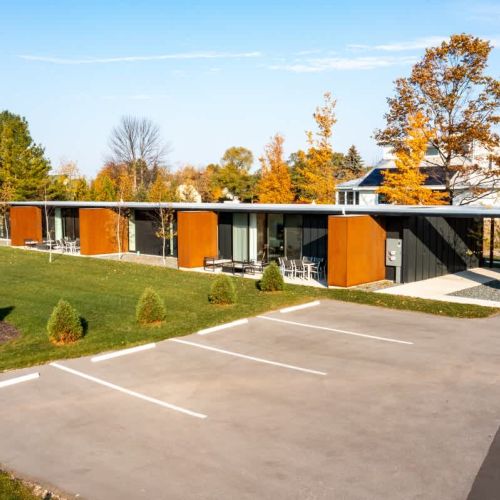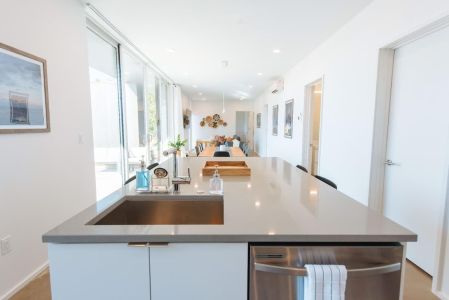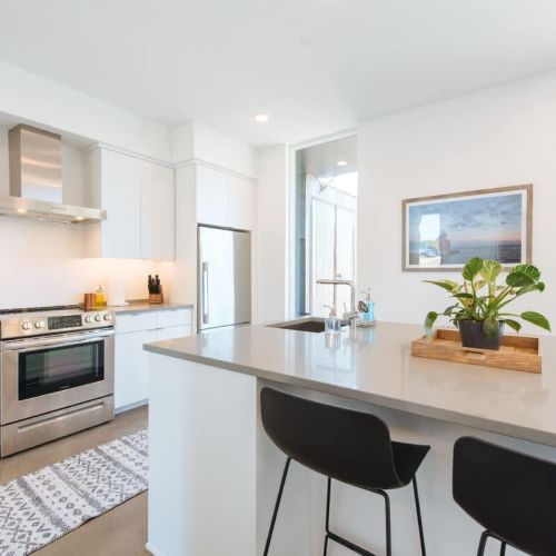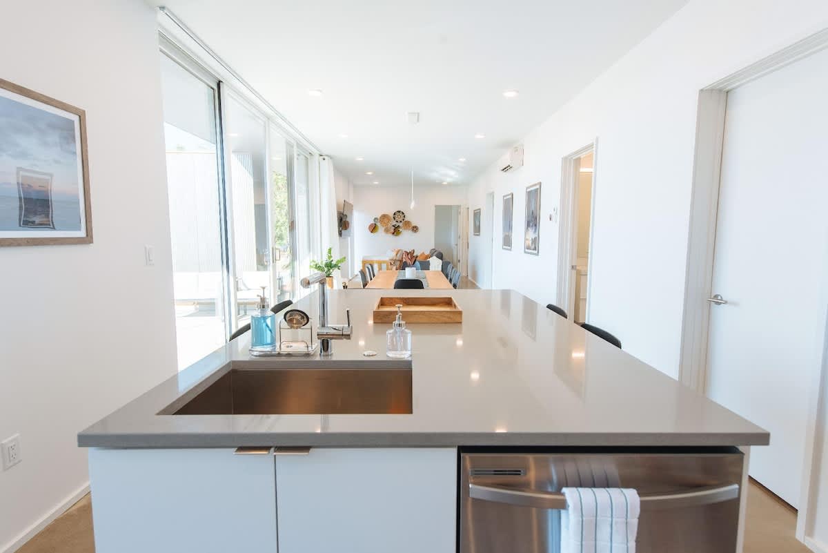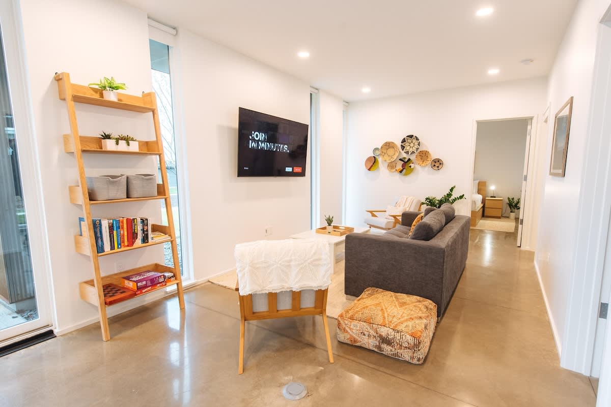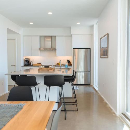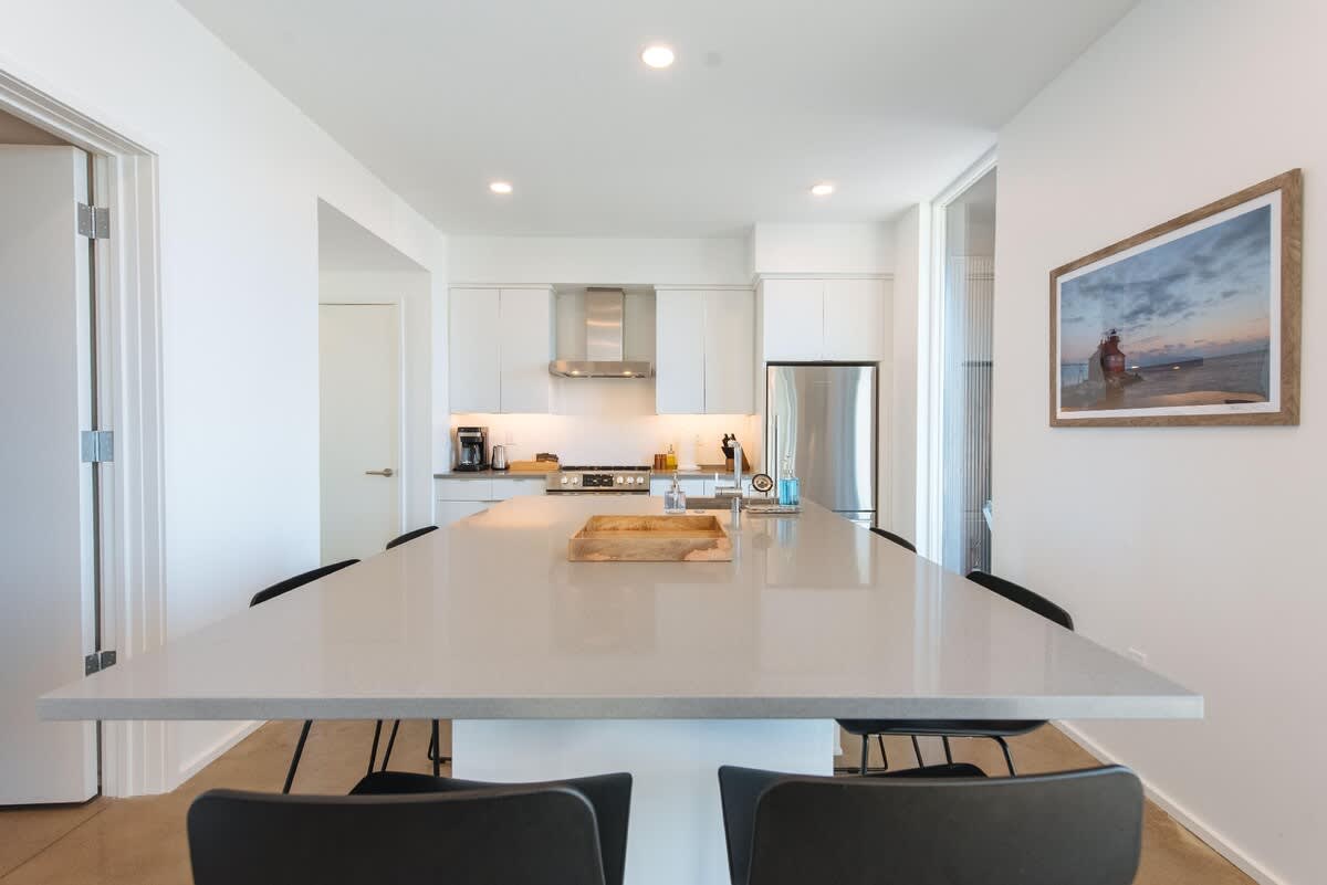 Measuring 1500 sq ft, the Flat features a kitchen with quartz countertops, stainless steel appliances, and all the amenities needed to prepare meals. The open concept living area includes table seating for 8, and large sliding glass doors that open to a private patio. The patio has comfortable seating around a gas firepit and a gas grill.