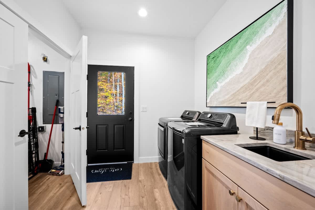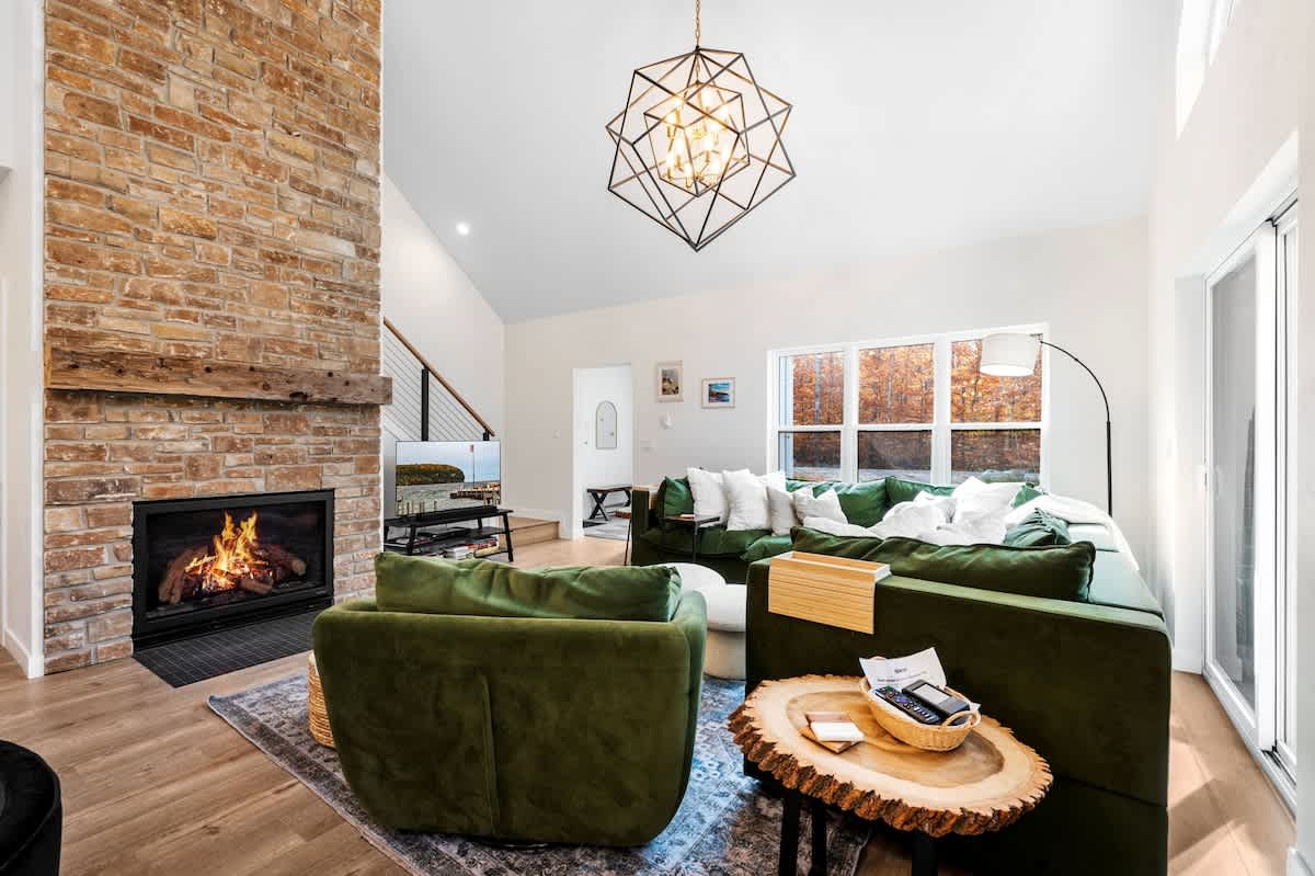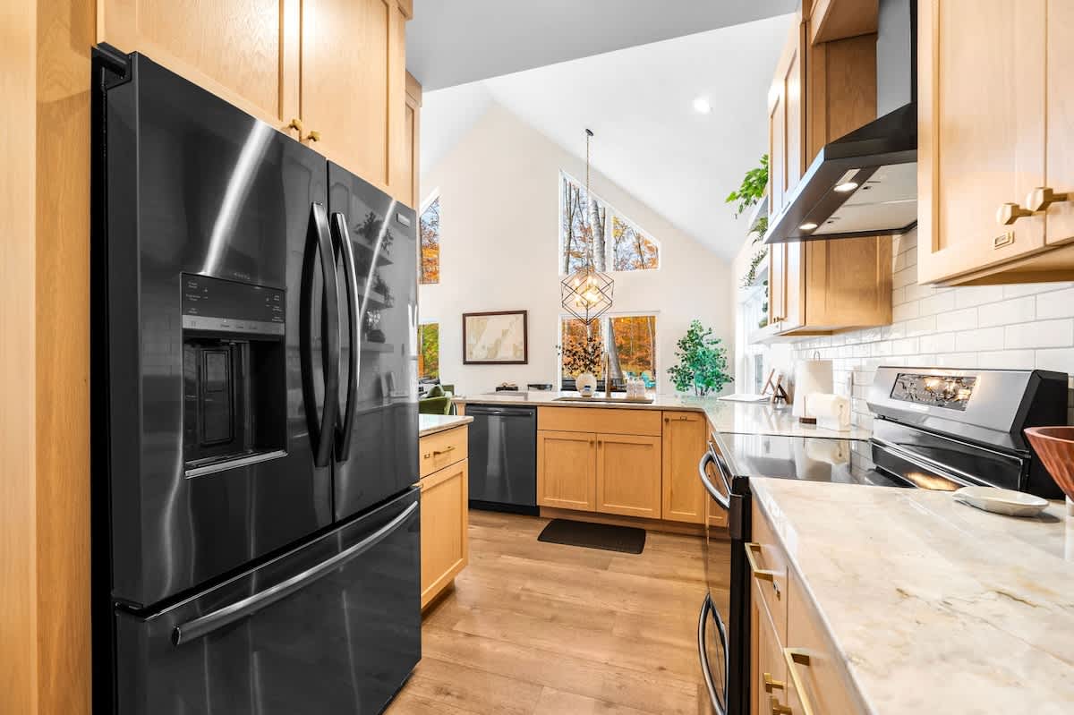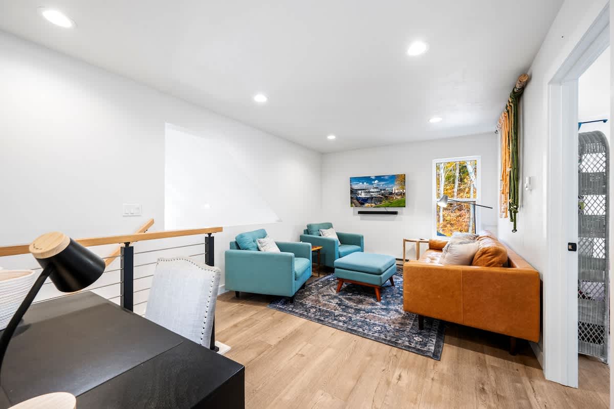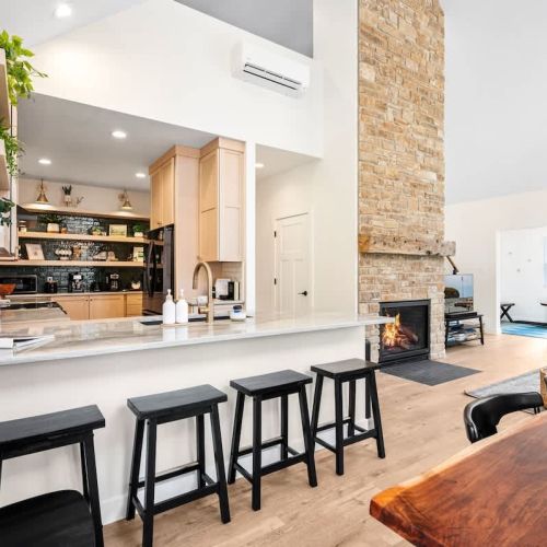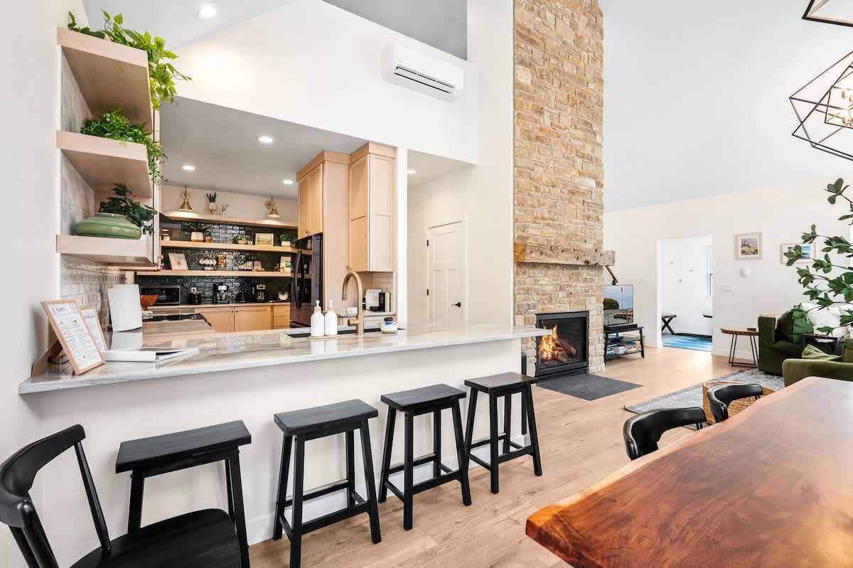 The open-concept living space is both inviting and functional, perfect for gathering after a day of adventure. Relax by the gas fireplace, spin some vintage vinyl, or watch your favorite shows on the smart TV. For those seeking a quiet workspace, a dedicated desk with Starlink Wi-Fi ensures you can stay connected if needed.