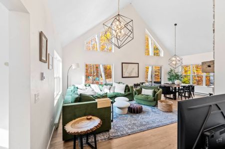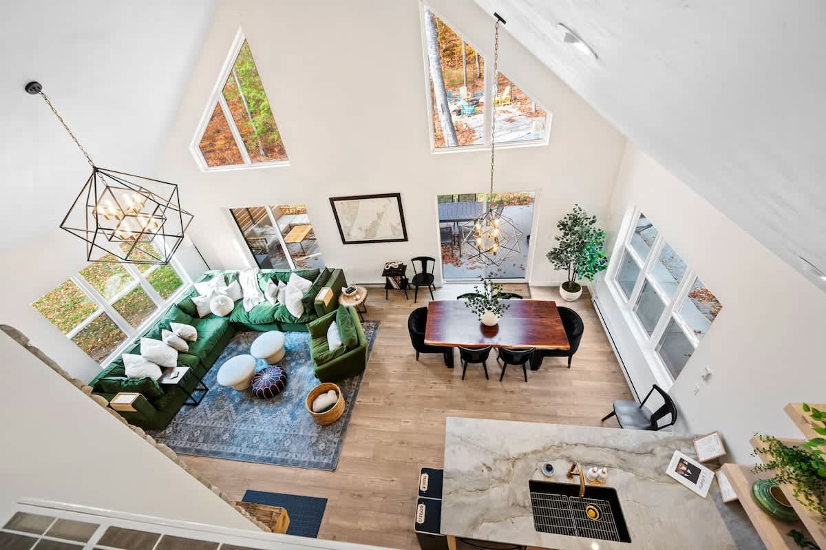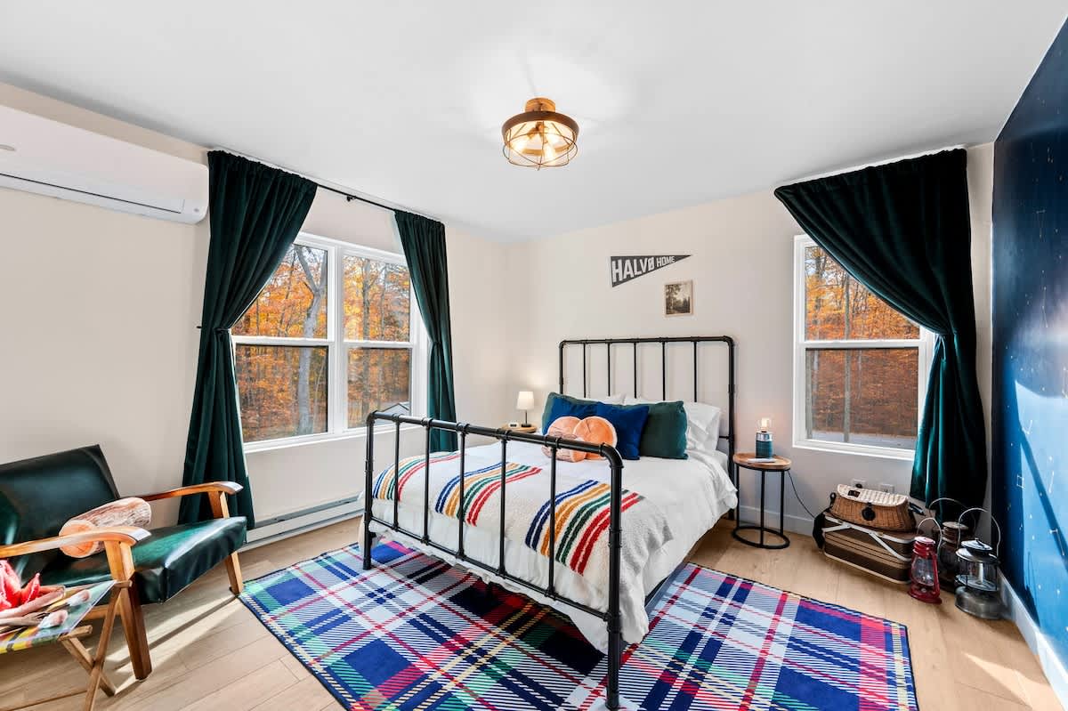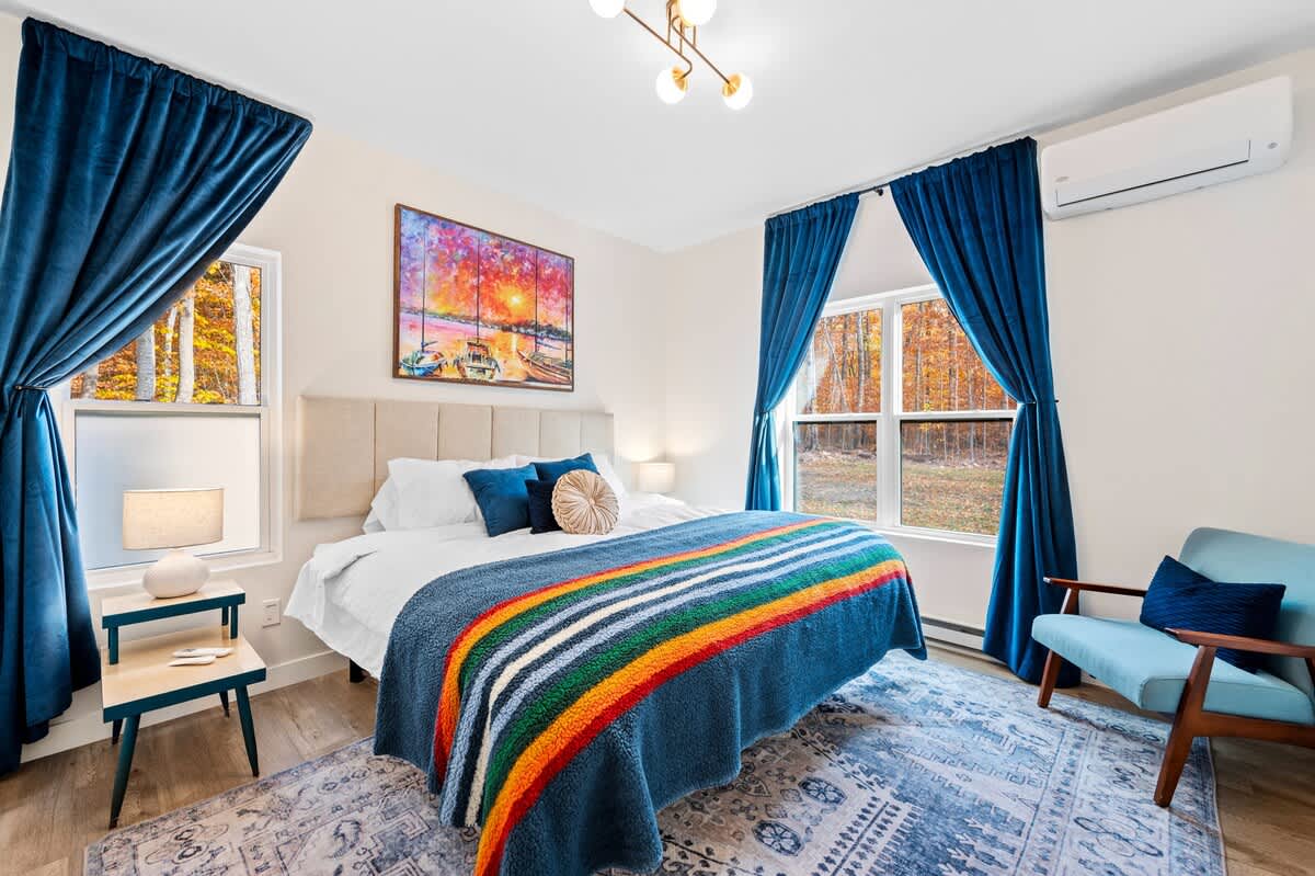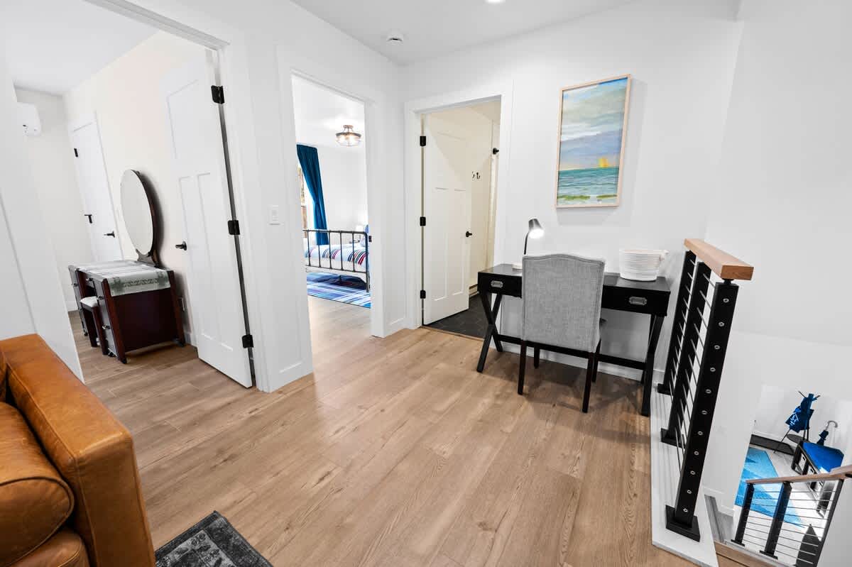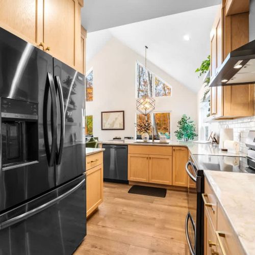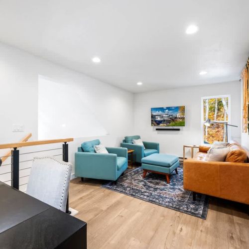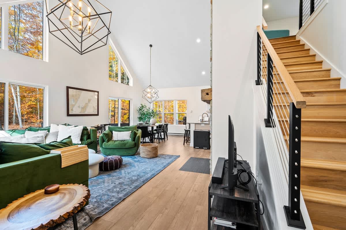 The open-concept living space is both inviting and functional, perfect for gathering after a day of adventure. Relax by the gas fireplace, spin some vintage vinyl, or watch your favorite shows on the smart TV. For those seeking a quiet workspace, a dedicated desk with Starlink Wi-Fi ensures you can stay connected if needed.