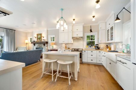 The living area centers around a stone wood-burning fireplace, offering a romantic spot to relax after a day of exploring. The fully equipped kitchen includes classic white cabinetry, butcher block counters, a drip coffee maker, and dishwasher—perfect for preparing meals together.