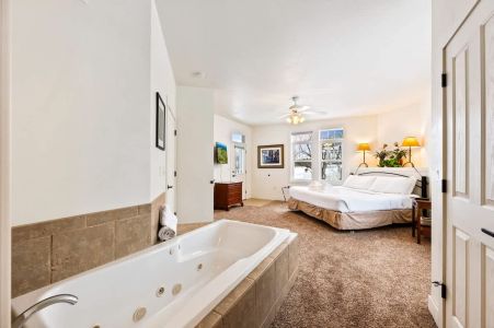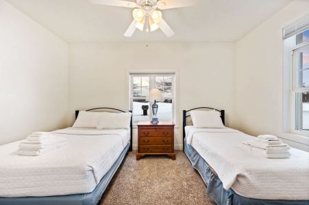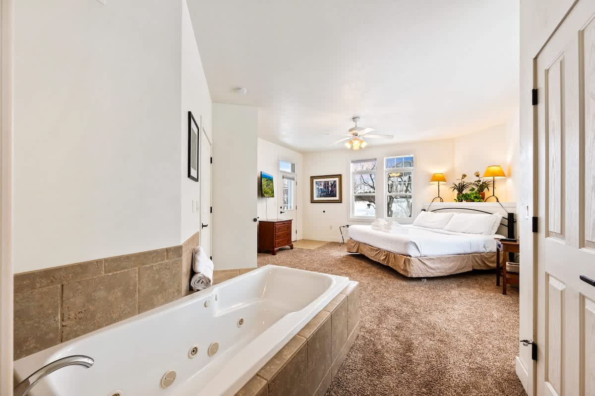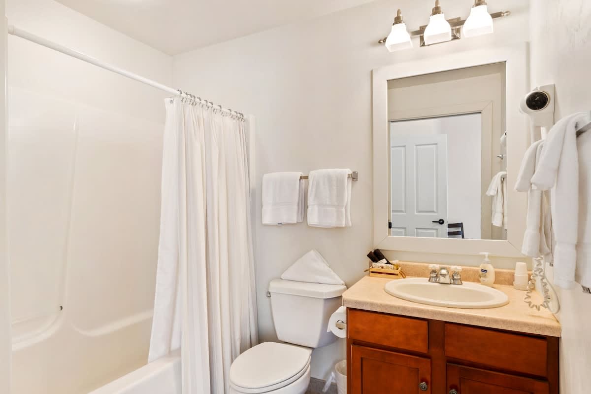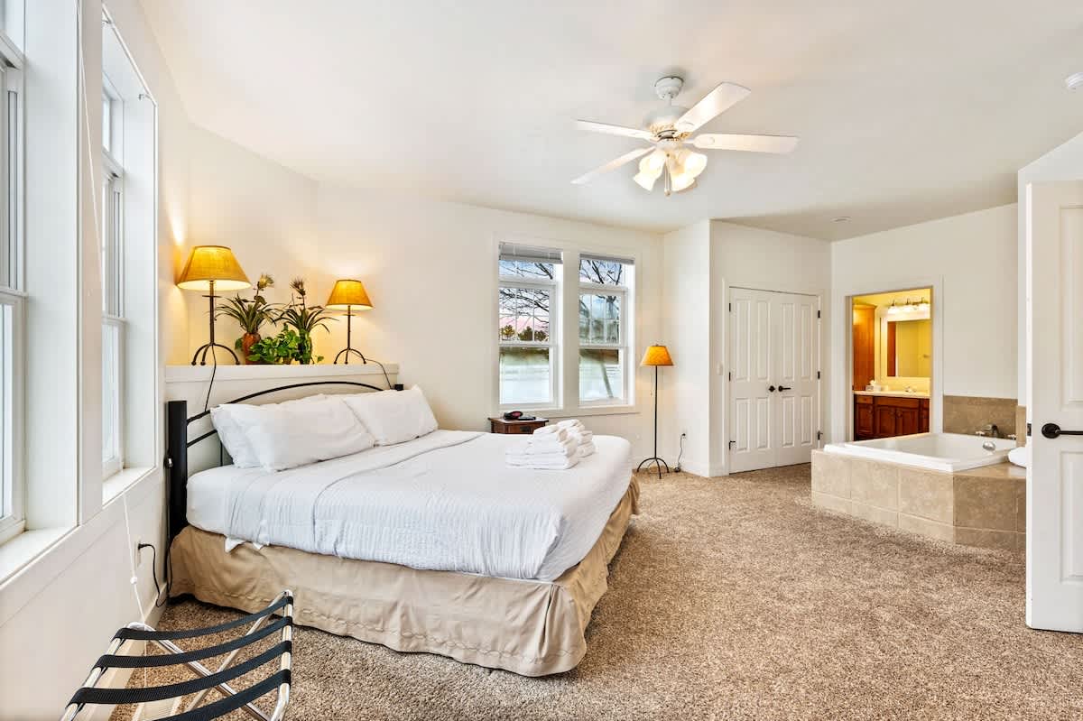 Club Cottage #3 is a lower level unit and boasts one king bedroom, a bedroom with a full bed and twin bed, and 2 en suite bathrooms, with queen-sized pull out couch for additional guests. Enjoy amenities such as indoor fireplace, jacuzzi tub, in-unit washer and dryer and a well-stocked kitchen for all you need to prepare small meals and snacks. Enjoy views of the grounds and outdoor seating on your own private deck/patio.