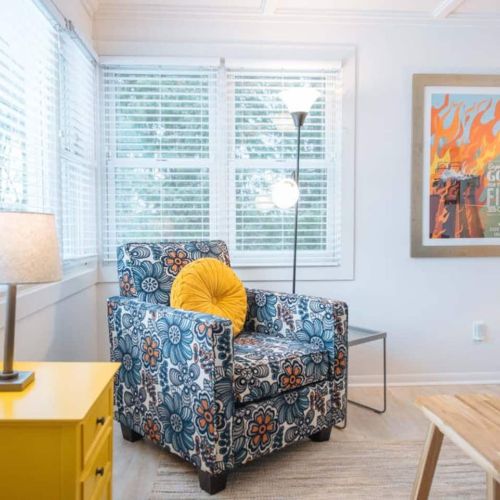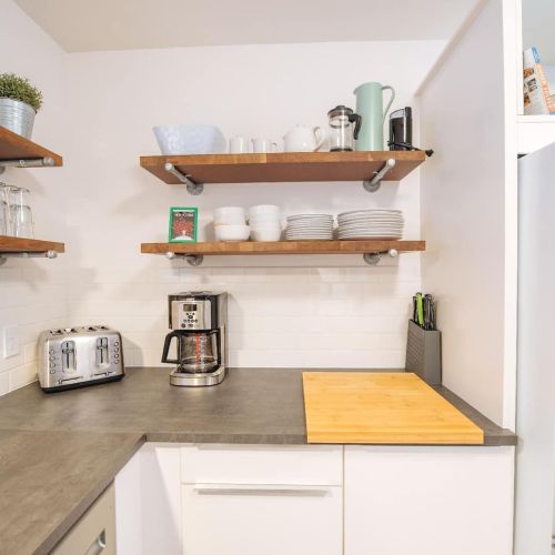 The heart of the home is the bright and open living area, where you can unwind with a good book from the small library or enjoy your favorite shows on the Smart TV, all supported by fast Wi-Fi. Adjacent to the living space is a fully equipped eat-in kitchen, stocked with all the appliances and essentials needed for cooking or baking. Whether you’re preparing a casual breakfast or a gourmet dinner, this kitchen has you covered.