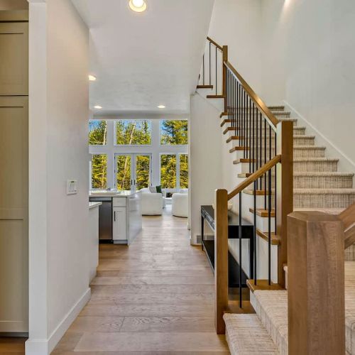 The main floor’s open-concept living area is a welcoming space with upscale décor, high-end finishes, and a grand fireplace that serves as a focal point. Floor-to-ceiling windows flood the room with natural light, showcasing the stunning lake views. The fully equipped kitchen is a chef’s dream, featuring modern appliances and plenty of counter space for preparing meals.