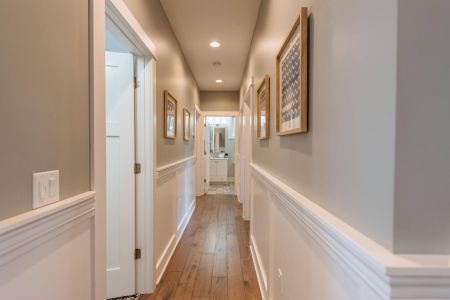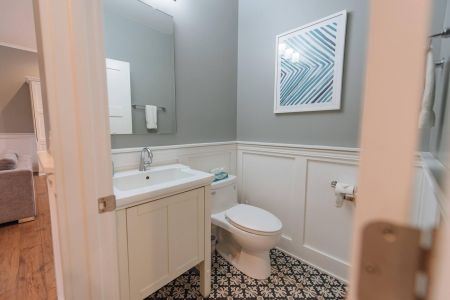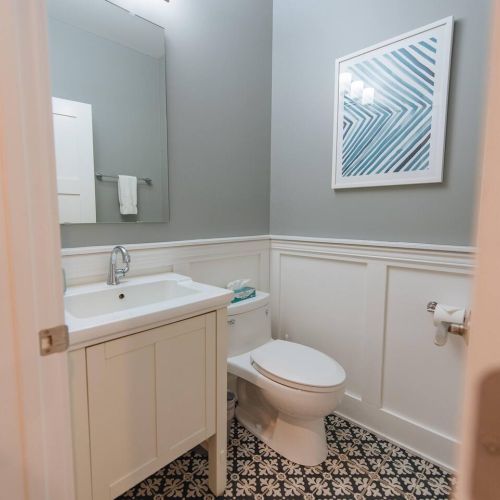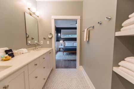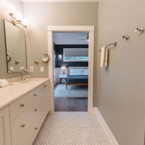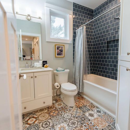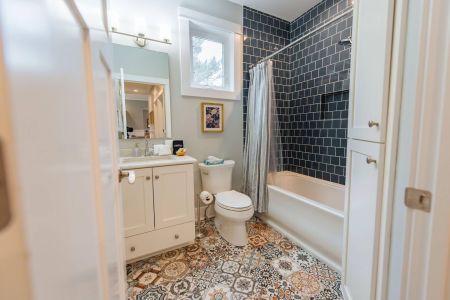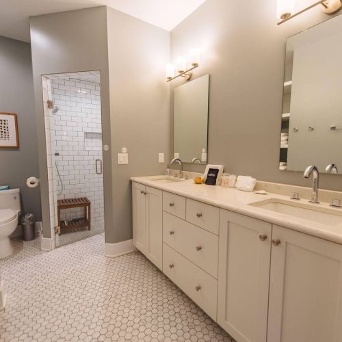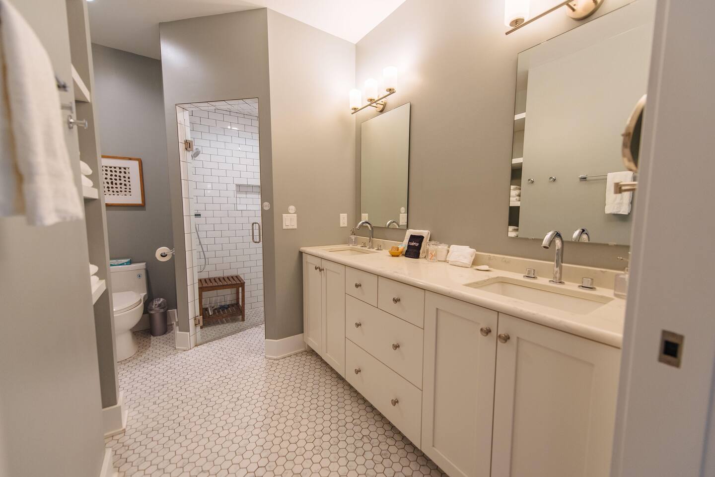 This home boasts three bedrooms, each a sanctuary of comfort with custom finishes. The master suite is a testament to no detail spared, featuring a king-size bed where you can indulge in restful nights, and a bathroom that stands out with its stunning tile shower and double vanity, complete with Kohler fixtures.