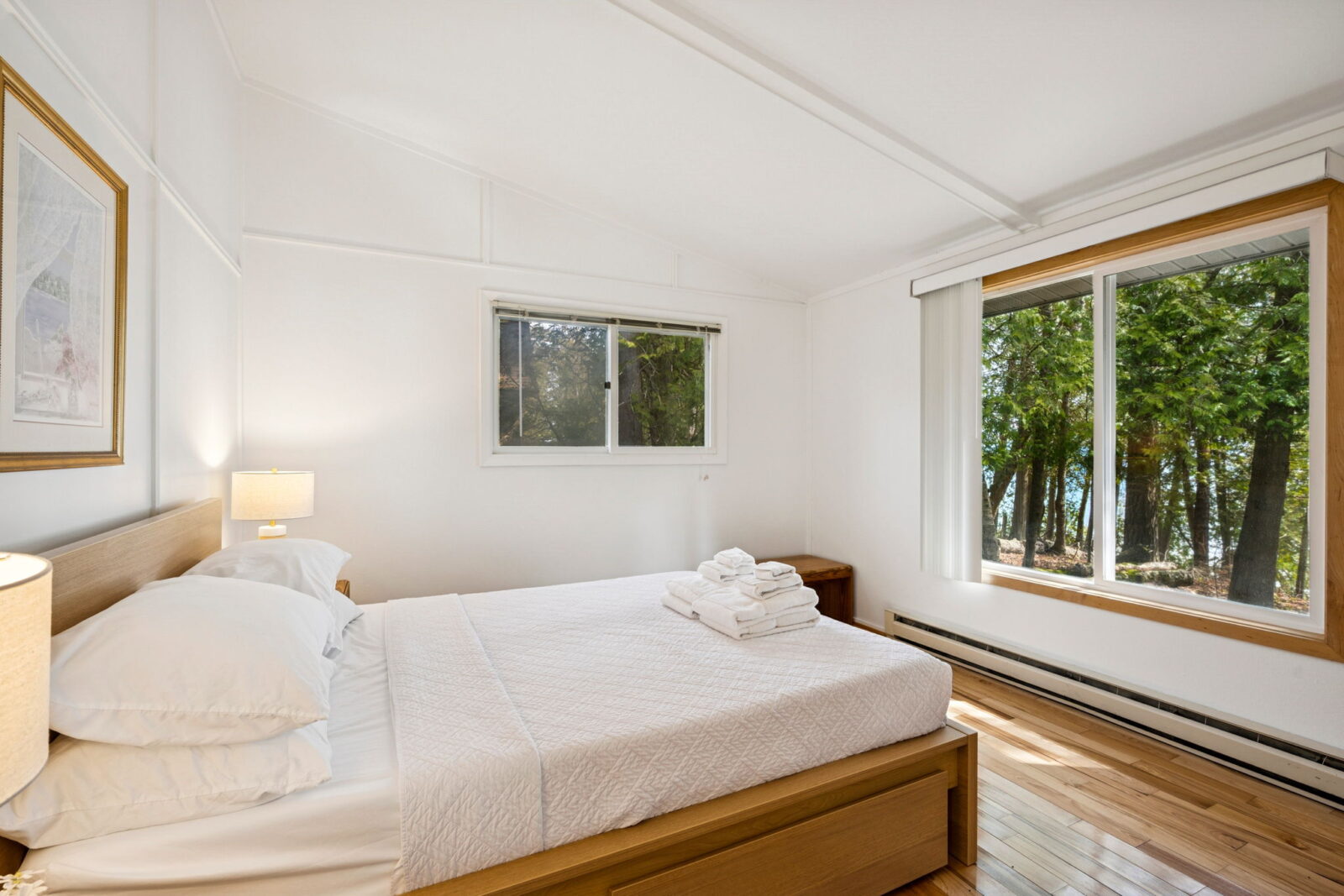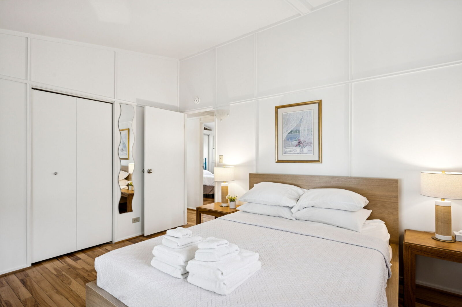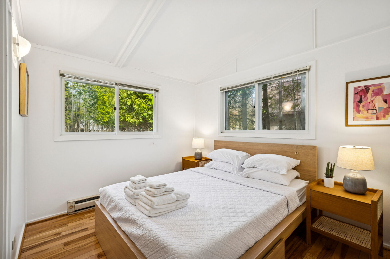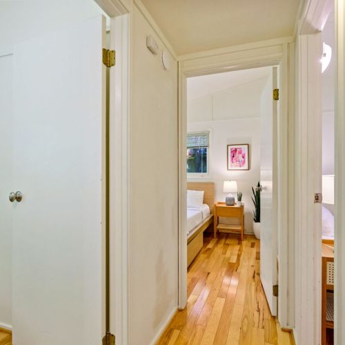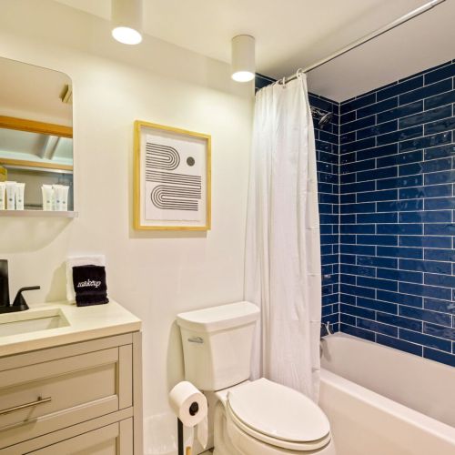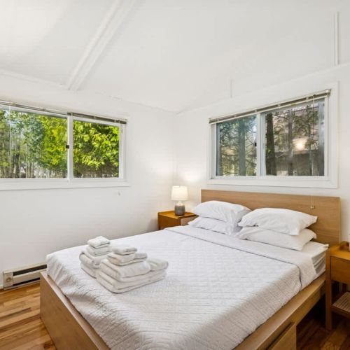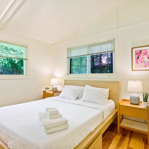 The fully renovated bathroom now features sleek fixtures, fresh tiling, and updated lighting for a spa-like feel. Bedrooms showcase plush new mattresses and linens—two with queen beds, the third with a twin—each space furnished thoughtfully for restful nights.
