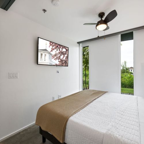 The Flats were designed to make the most of the 500 sq ft of space, with a king-sized bed in the bedroom, a beautifully tiled shower with modern fixtures in the bathroom, and a fully equipped kitchen with an induction cooktop stove, refrigerator, dishwasher, microwave, coffee maker, and all the necessary amenities for meal preparation.