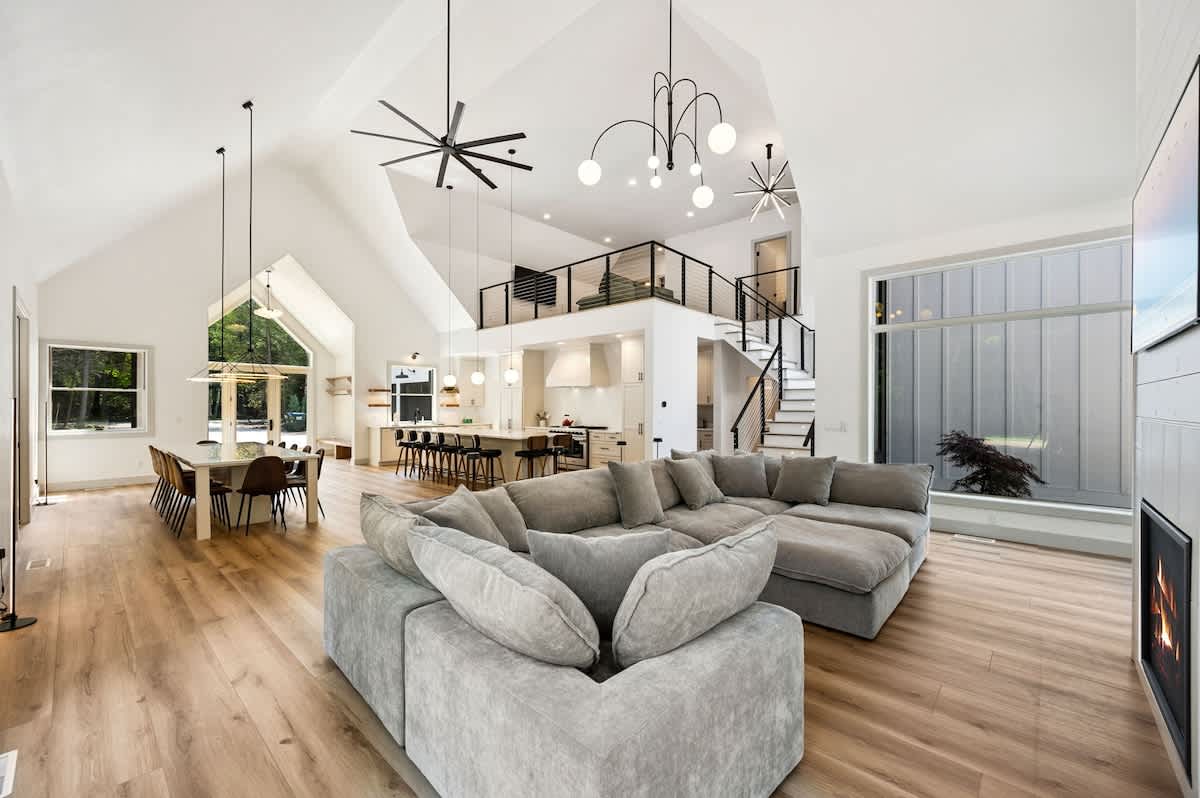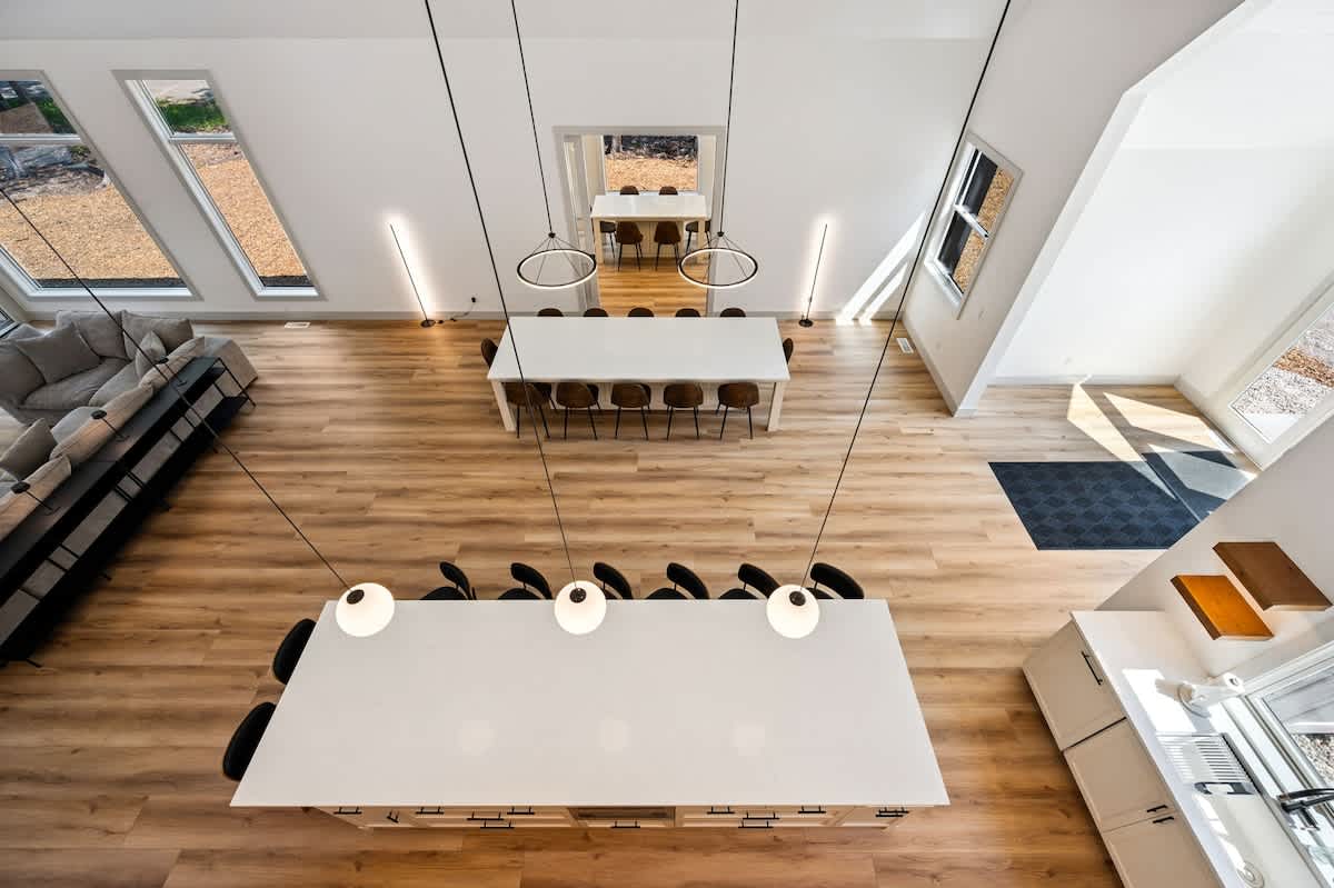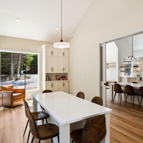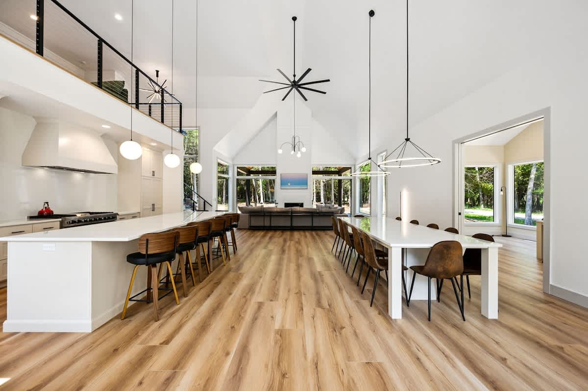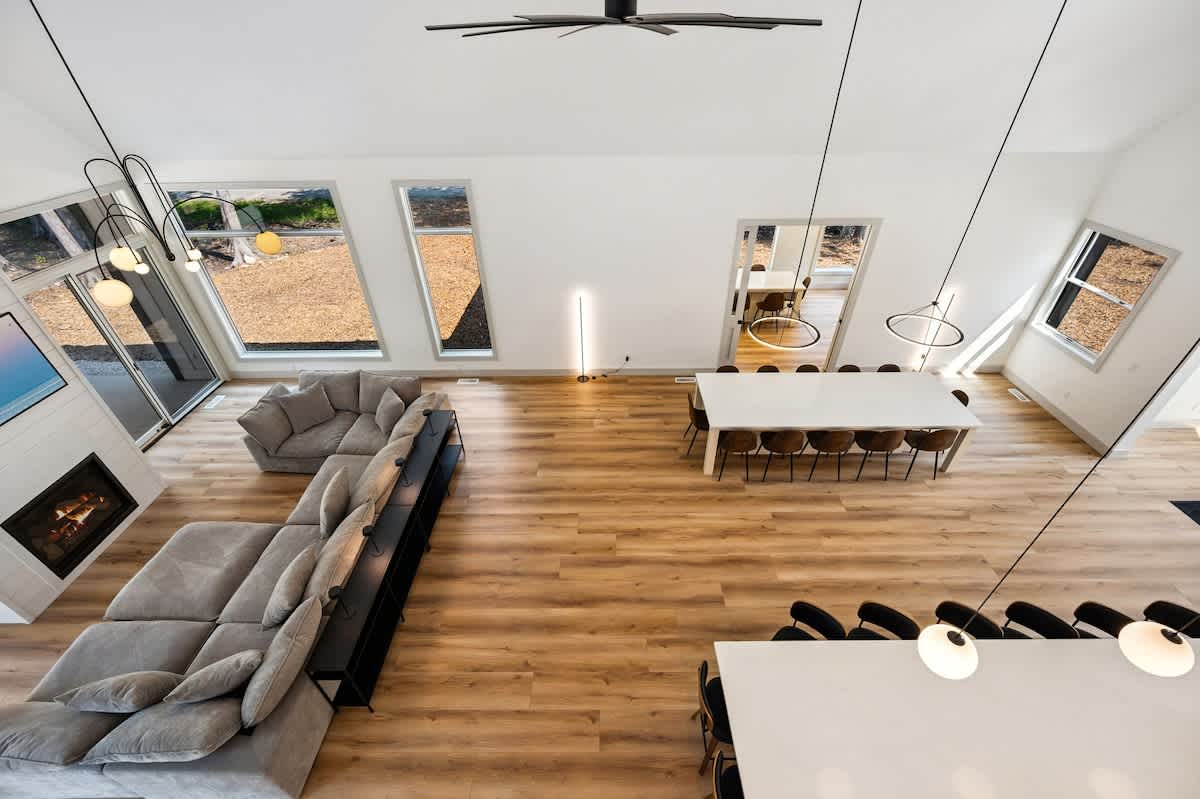 The open-concept living and dining areas boast soaring ceilings, large windows, and clean Scandinavian lines, creating a warm, light-filled space ideal for gathering. The fully equipped kitchen is outfitted with high-end appliances and generous counter space—perfect for preparing group meals or late-night snacks.