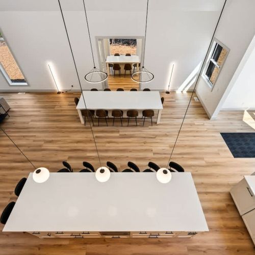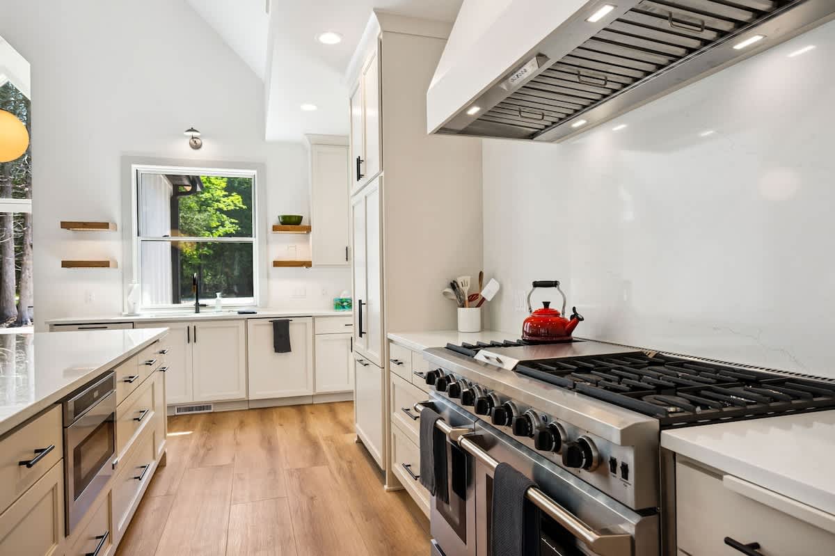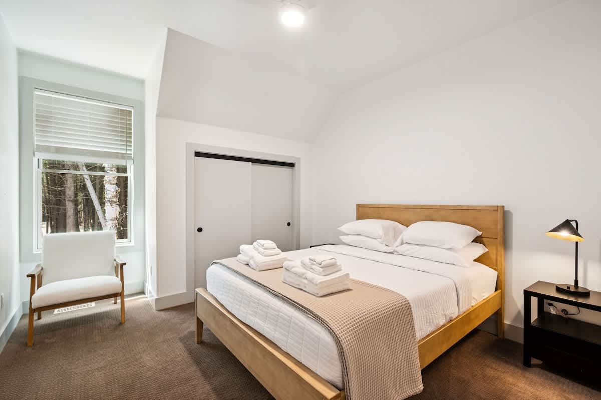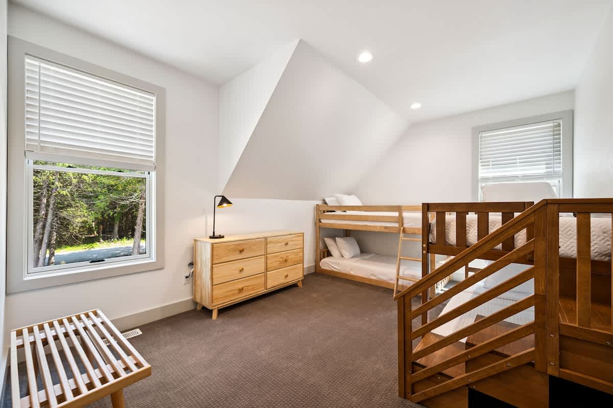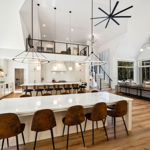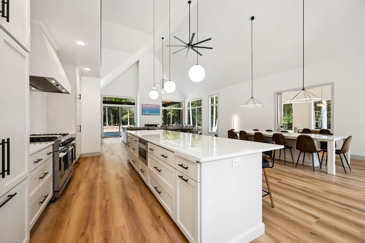 The open-concept living and dining areas boast soaring ceilings, large windows, and clean Scandinavian lines, creating a warm, light-filled space ideal for gathering. The fully equipped kitchen is outfitted with high-end appliances and generous counter space—perfect for preparing group meals or late-night snacks.