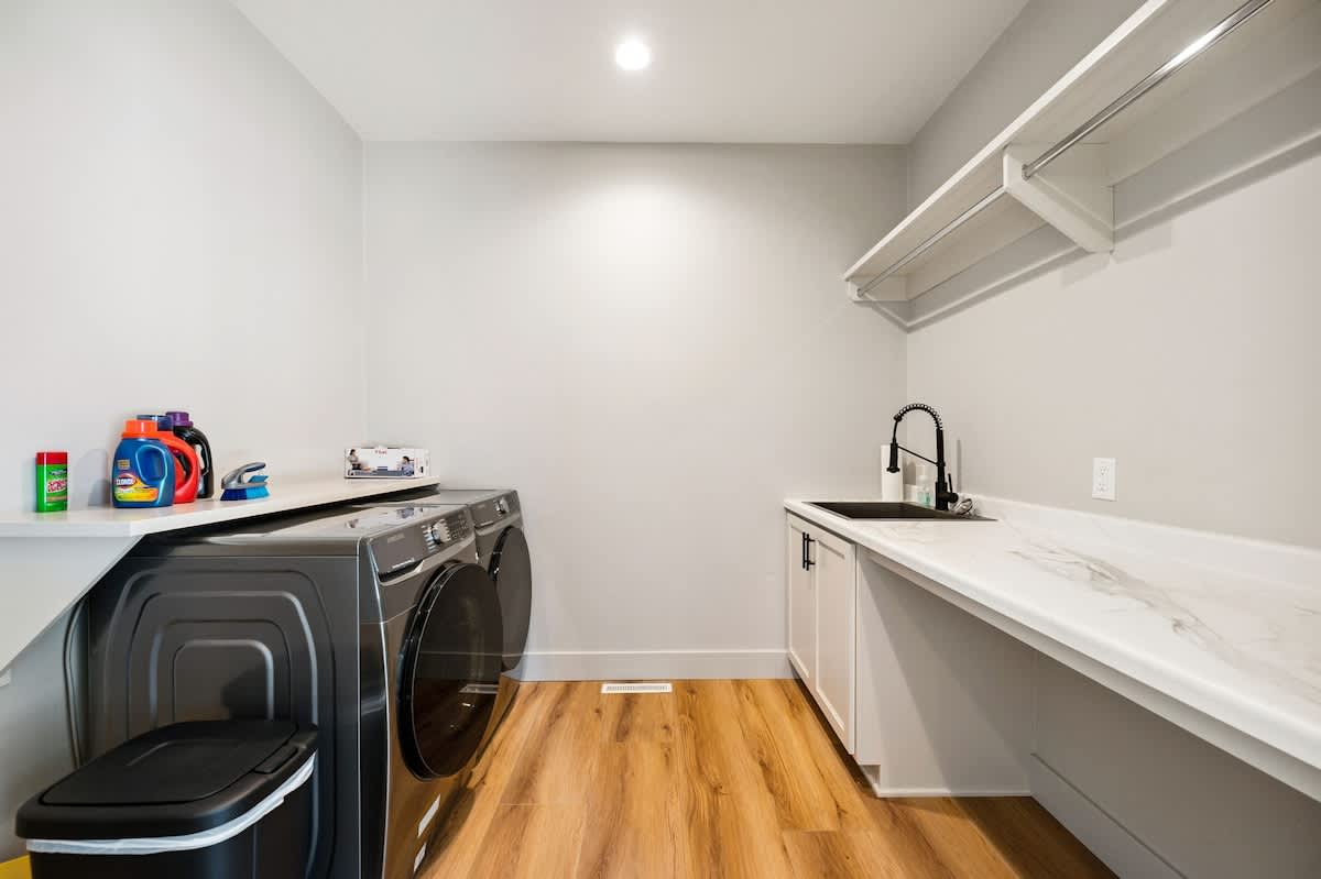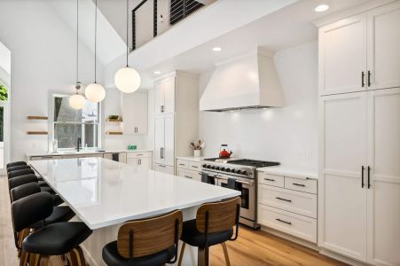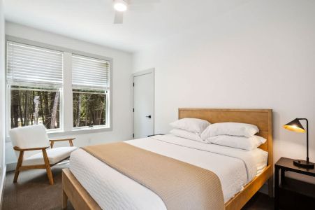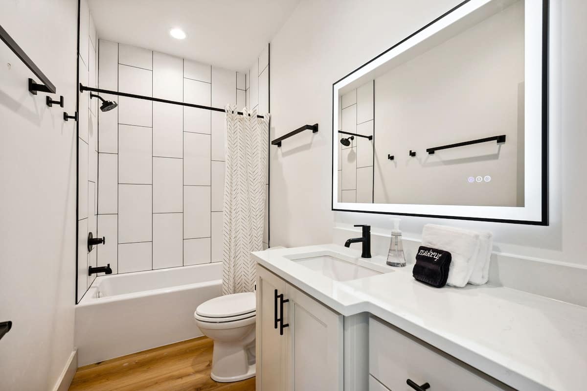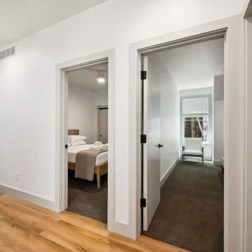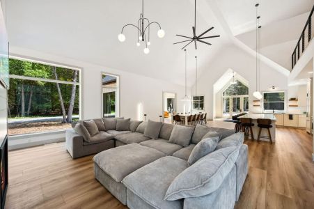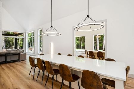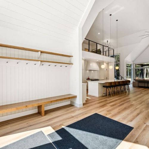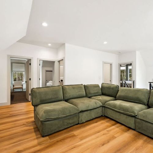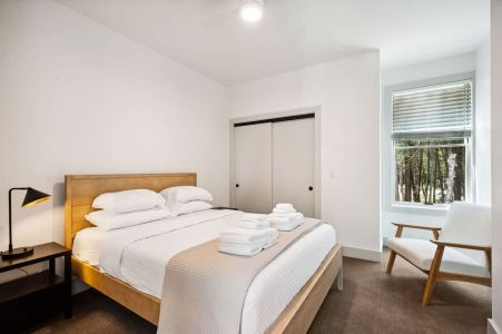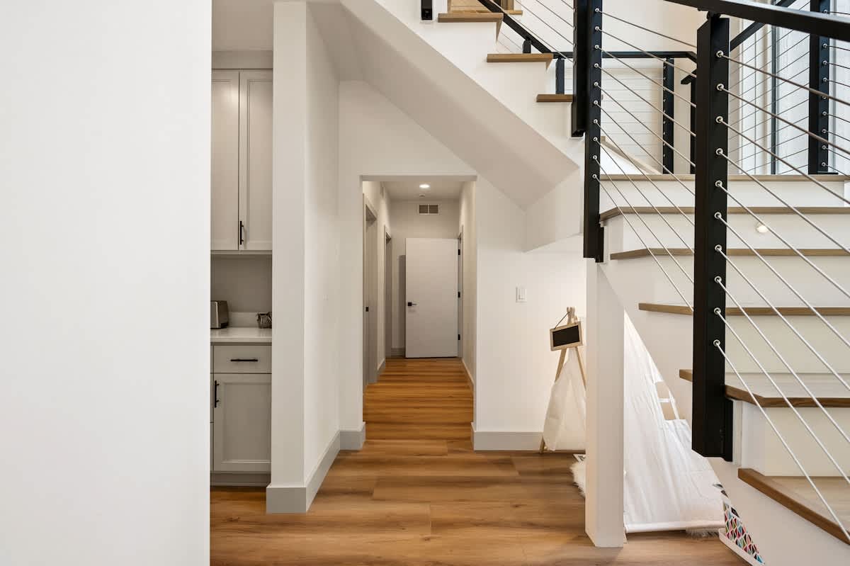 The open-concept living and dining areas boast soaring ceilings, large windows, and clean Scandinavian lines, creating a warm, light-filled space ideal for gathering. The fully equipped kitchen is outfitted with high-end appliances and generous counter space—perfect for preparing group meals or late-night snacks.