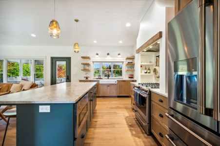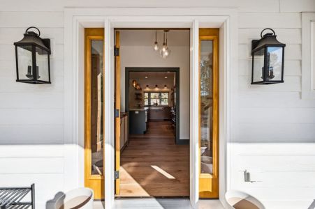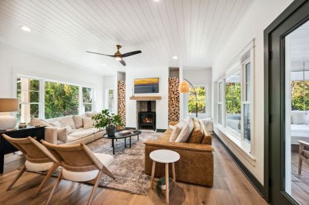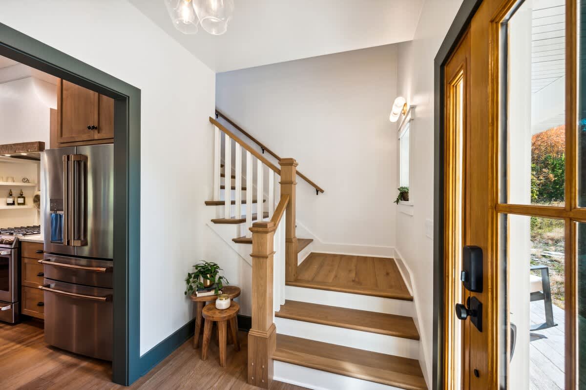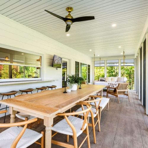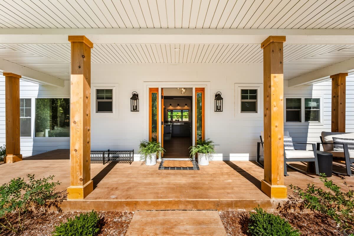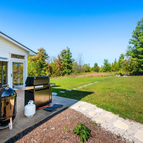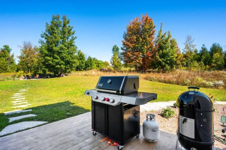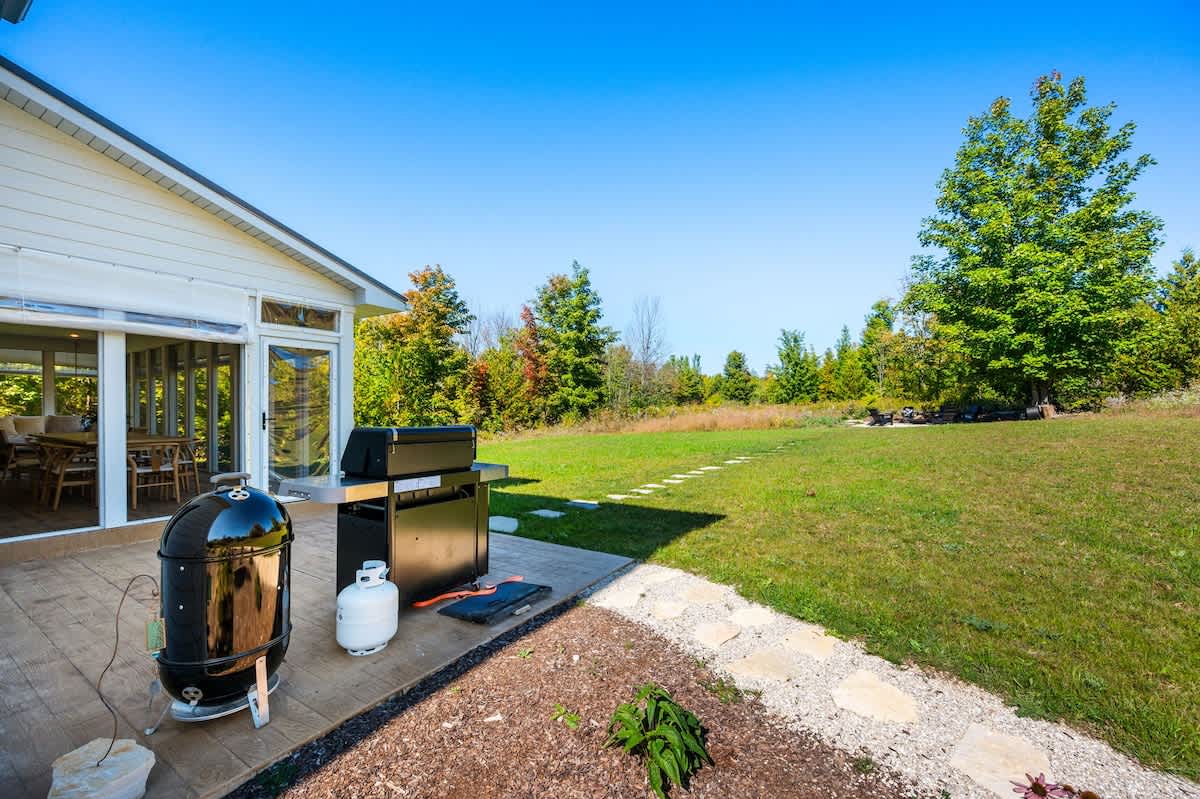 The wrap-around front porch provides additional outdoor living space, perfect for lounging and taking in the wooded surroundings. Outside, you’ll also find a barbecue and outdoor seating area, making al fresco dining a must.