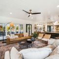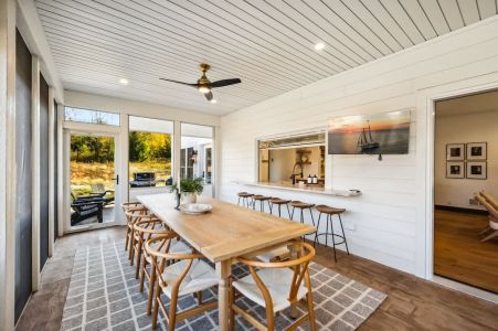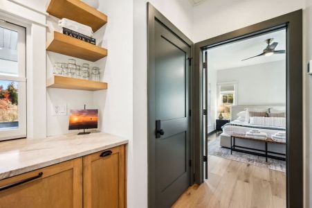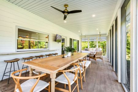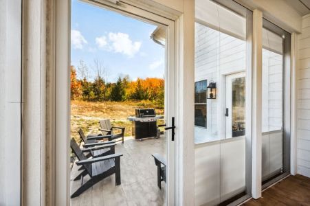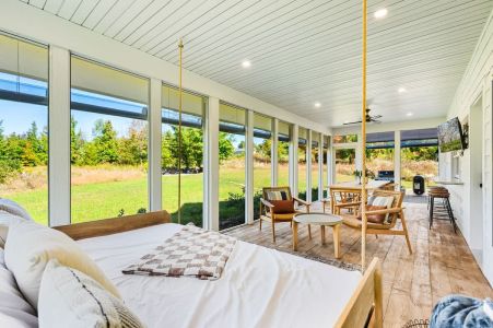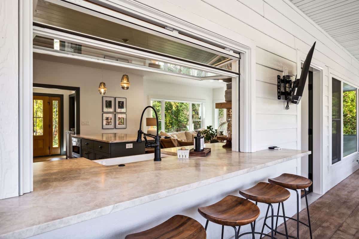 The open-concept living area invites you to relax in front of the gas hearth fireplace, with high-speed WiFi and Smart TVs available throughout the home for your entertainment. The gourmet kitchen is a chef’s dream, complete with high-end appliances and a fold-up window that opens into the large screened-in porch. This porch is a standout feature, offering a cozy swing bed, TV, and seating area where you can enjoy meals, morning coffee, or quiet evenings surrounded by nature.